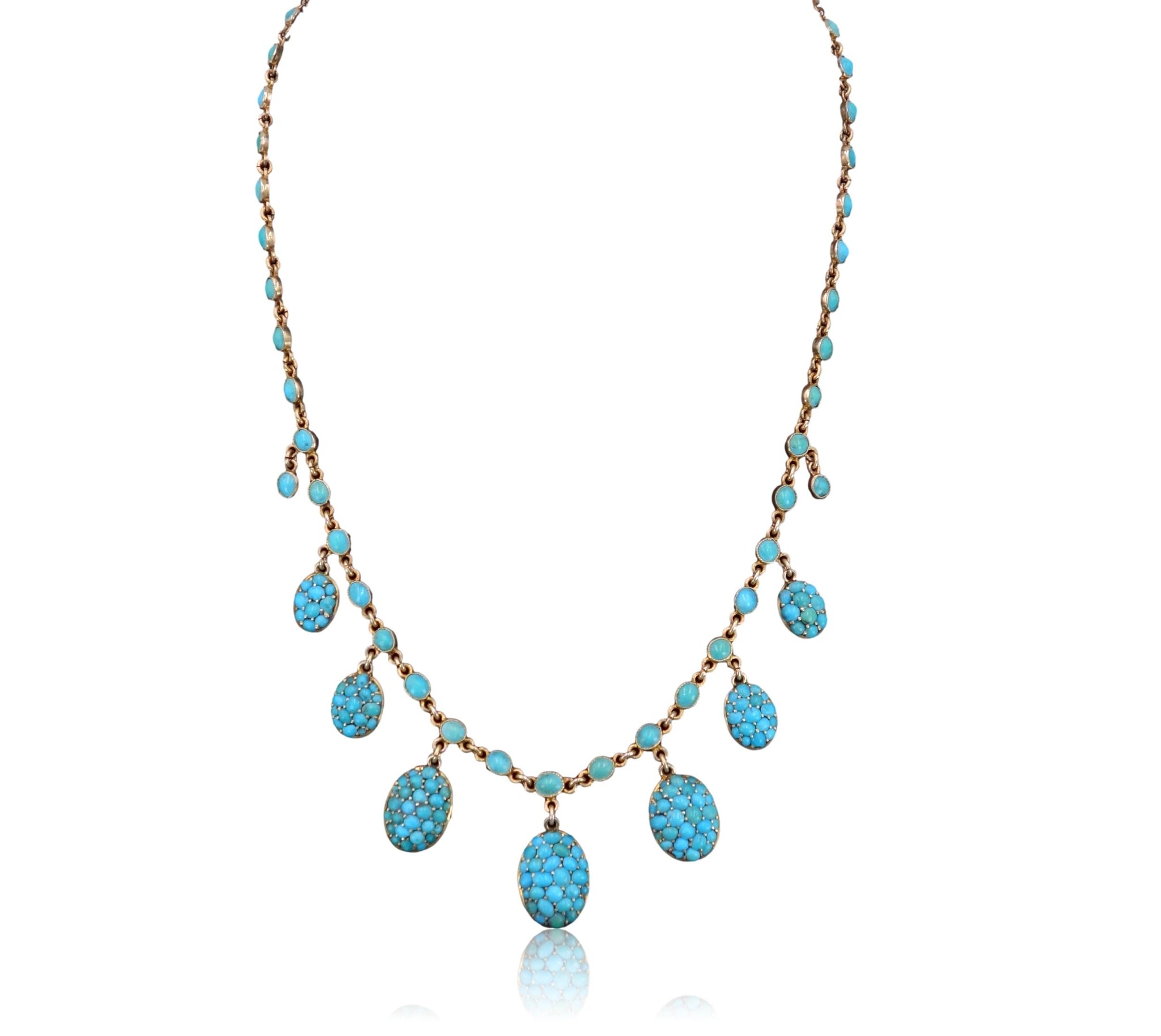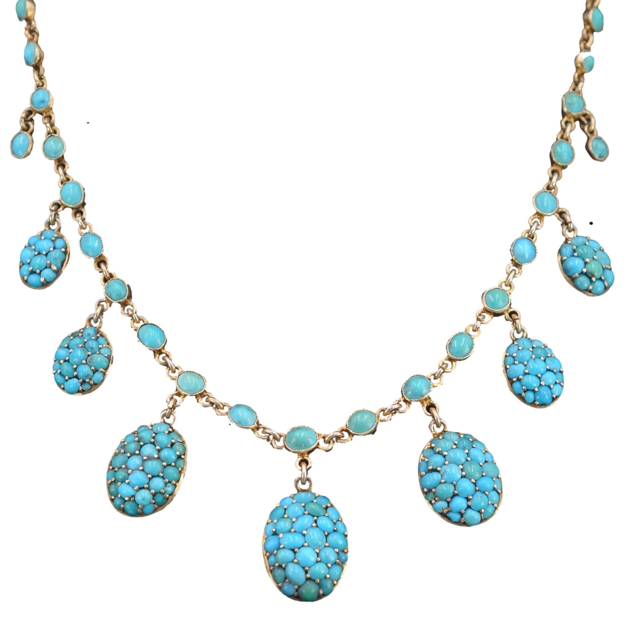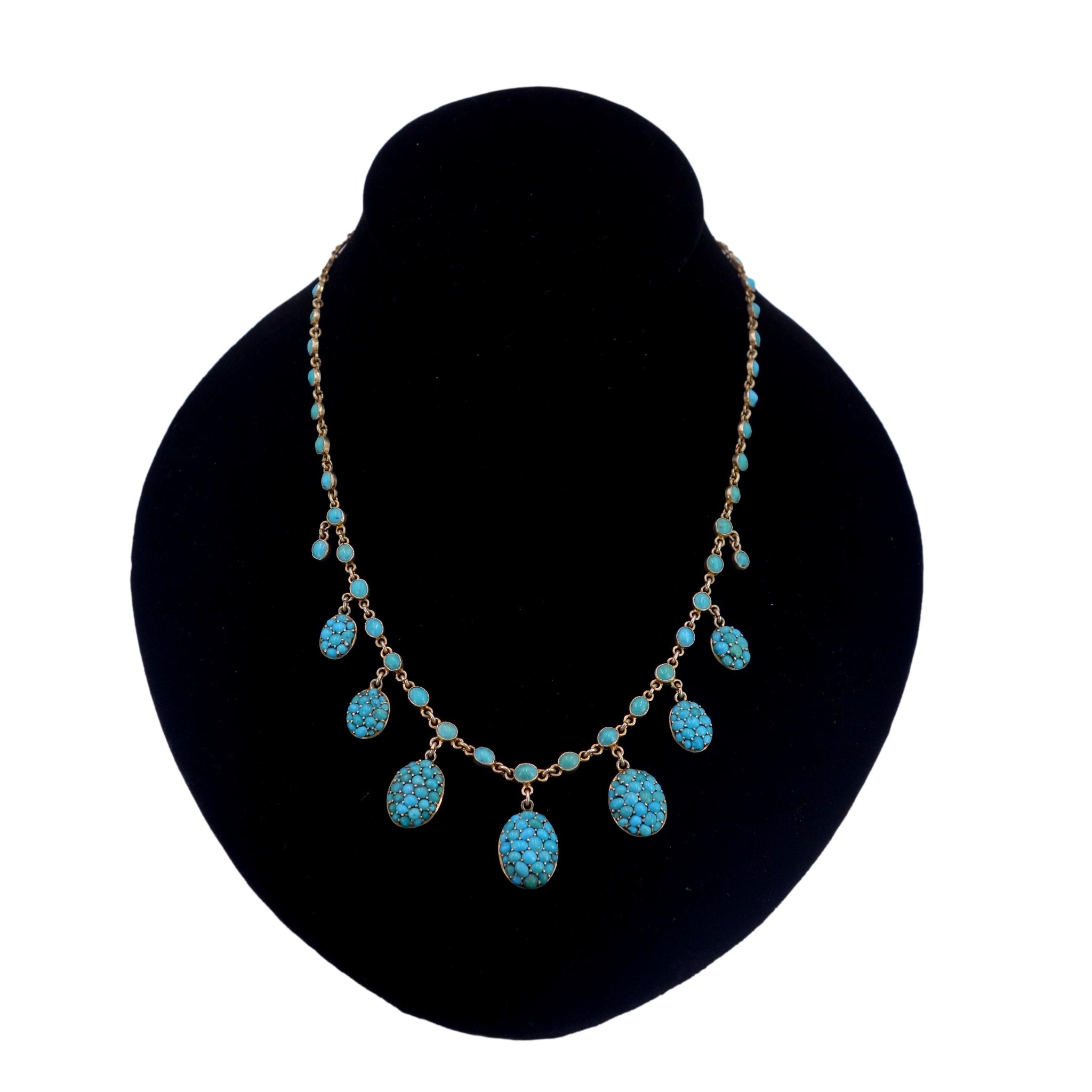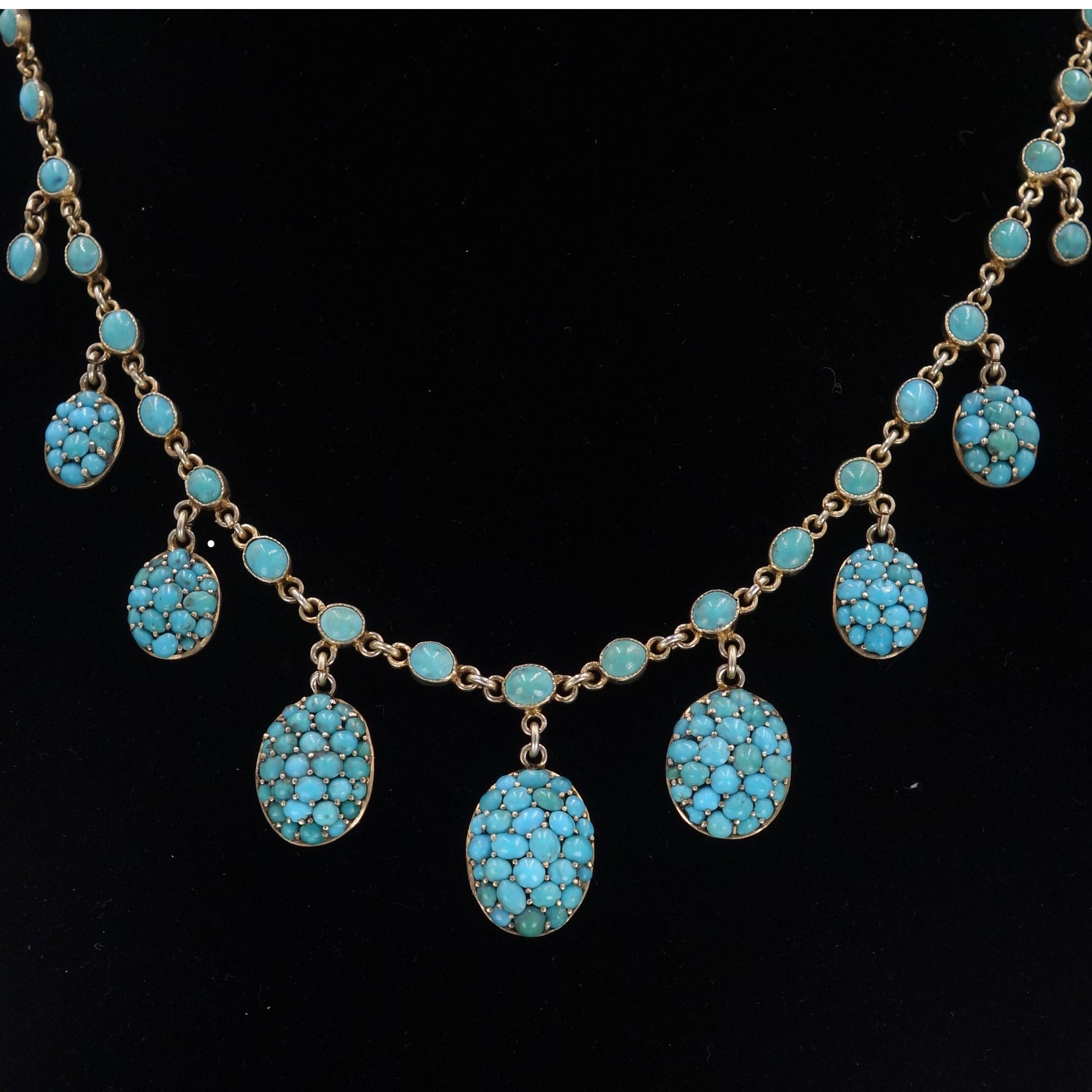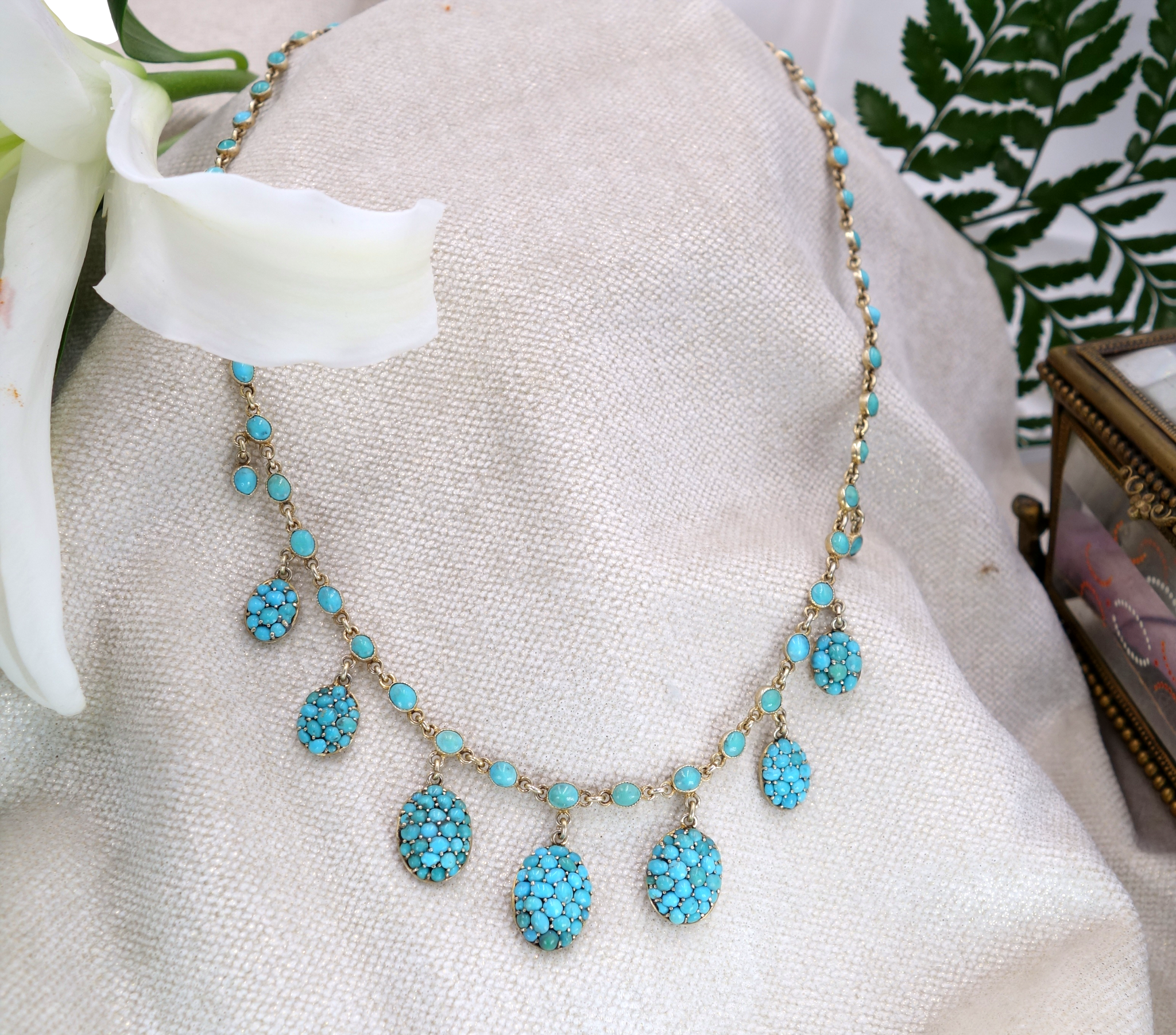 This exceptional antique necklace is a showpiece of early 20th Century design. Made in the Edwardian period, circa 1910, it features one of the most beautiful and sought after features of vintage jewelry- pave set turquoise. Numerous beautiful blue turquoise cabochons are carefully set side by side to form a single cohesive design. A typical design of this period, this garland swag necklace features nine drops, elegantly graduated in size and most extraordinarily the turquoise cabochons continue up the chain and there is another pave set circular piece that covers the claps. Typical of the attention to detail and design you can only find with antique craftsmanship!