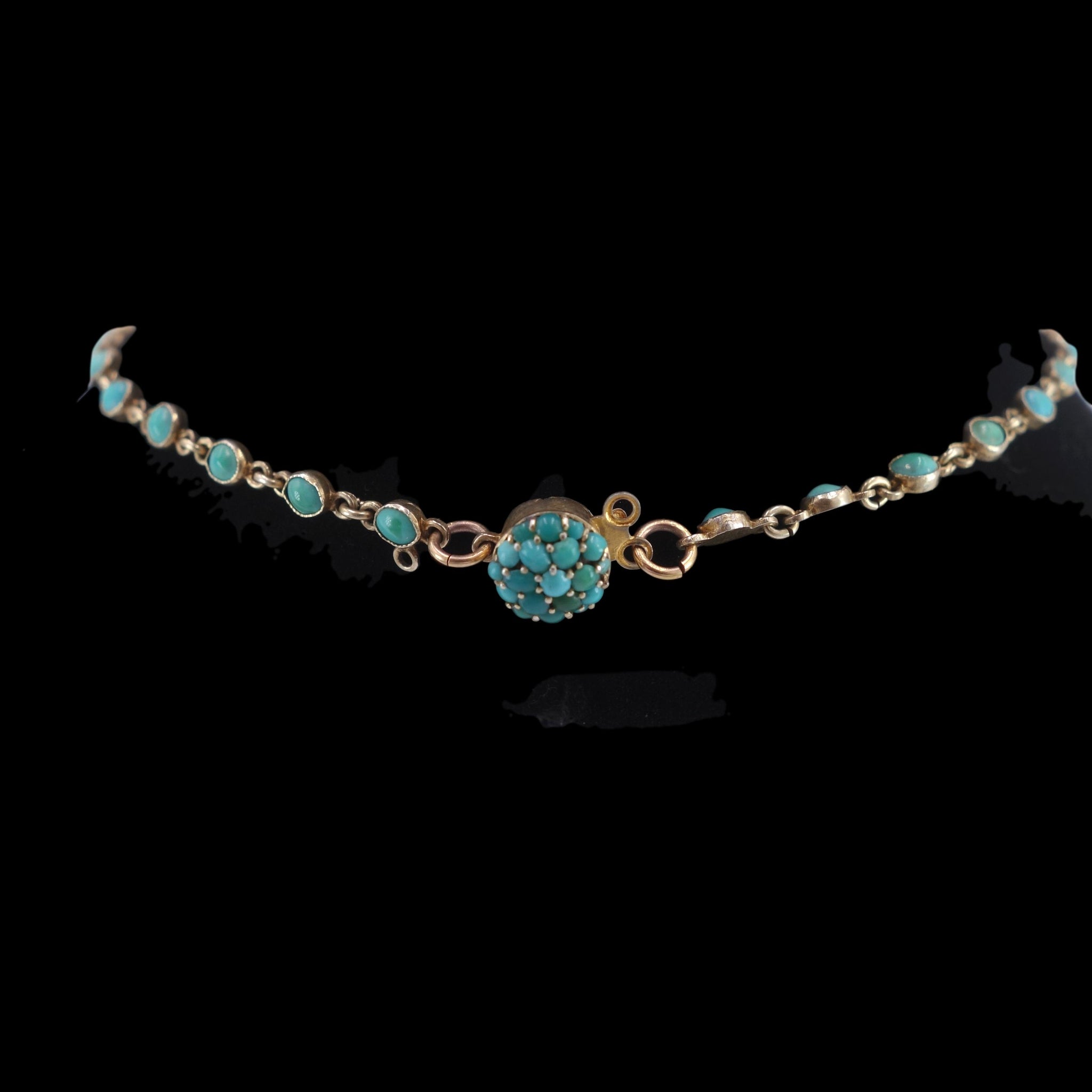 Condition: In very good antique condition. No missing stones. Clasp is secure. Loops available to add additional safety chain. One very small repair and small chip to one turquoise at bottom of one drop. Only visible under magnification. Additional photos and videos available upon request.