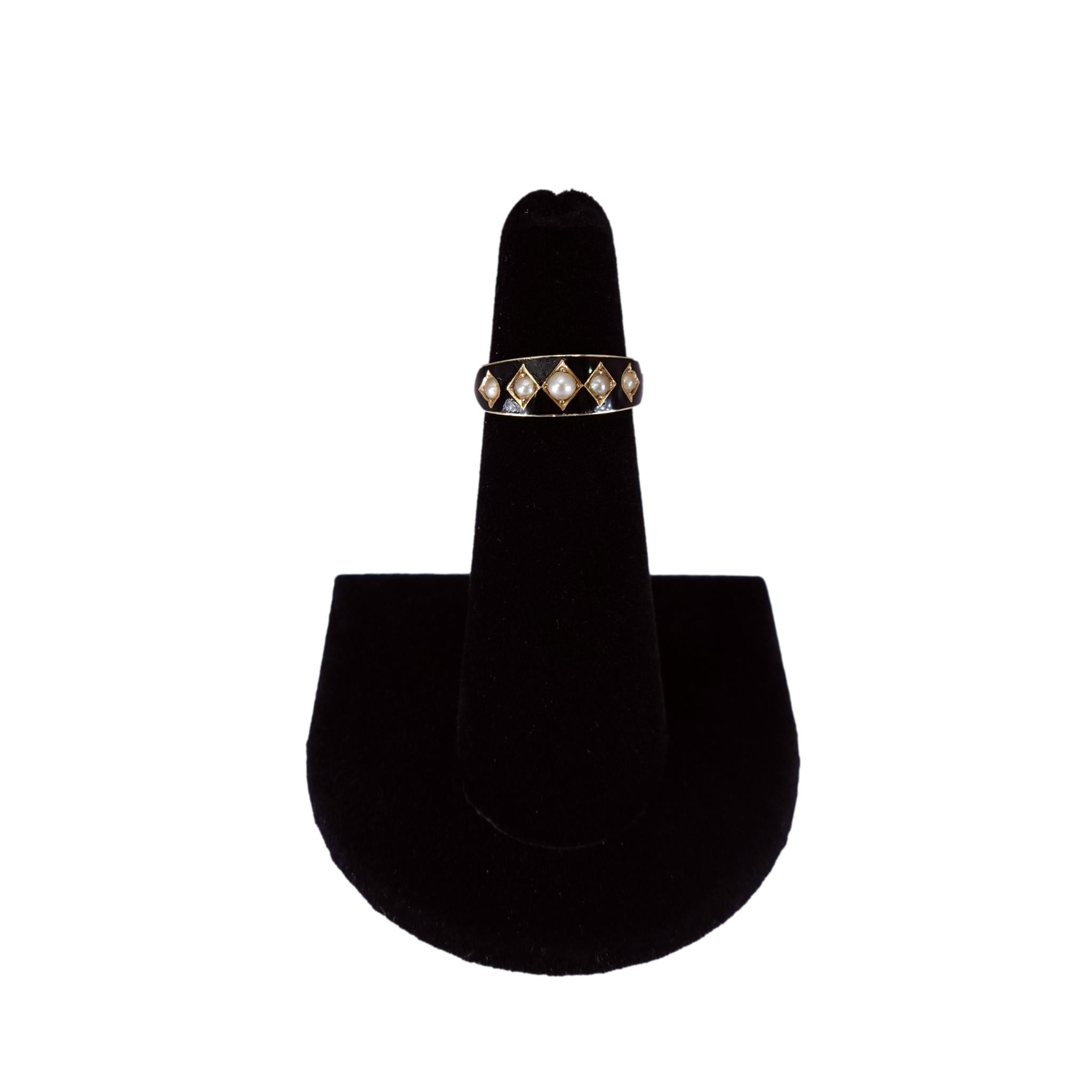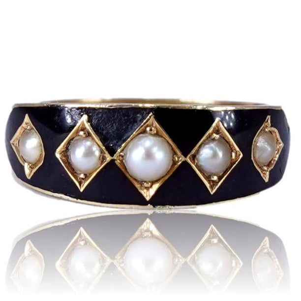 This striking antique ring is a beautiful example of English Victorian mourning jewelry. Crafted out of 15K yellow gold it is set with five pearls on a black enamel band.