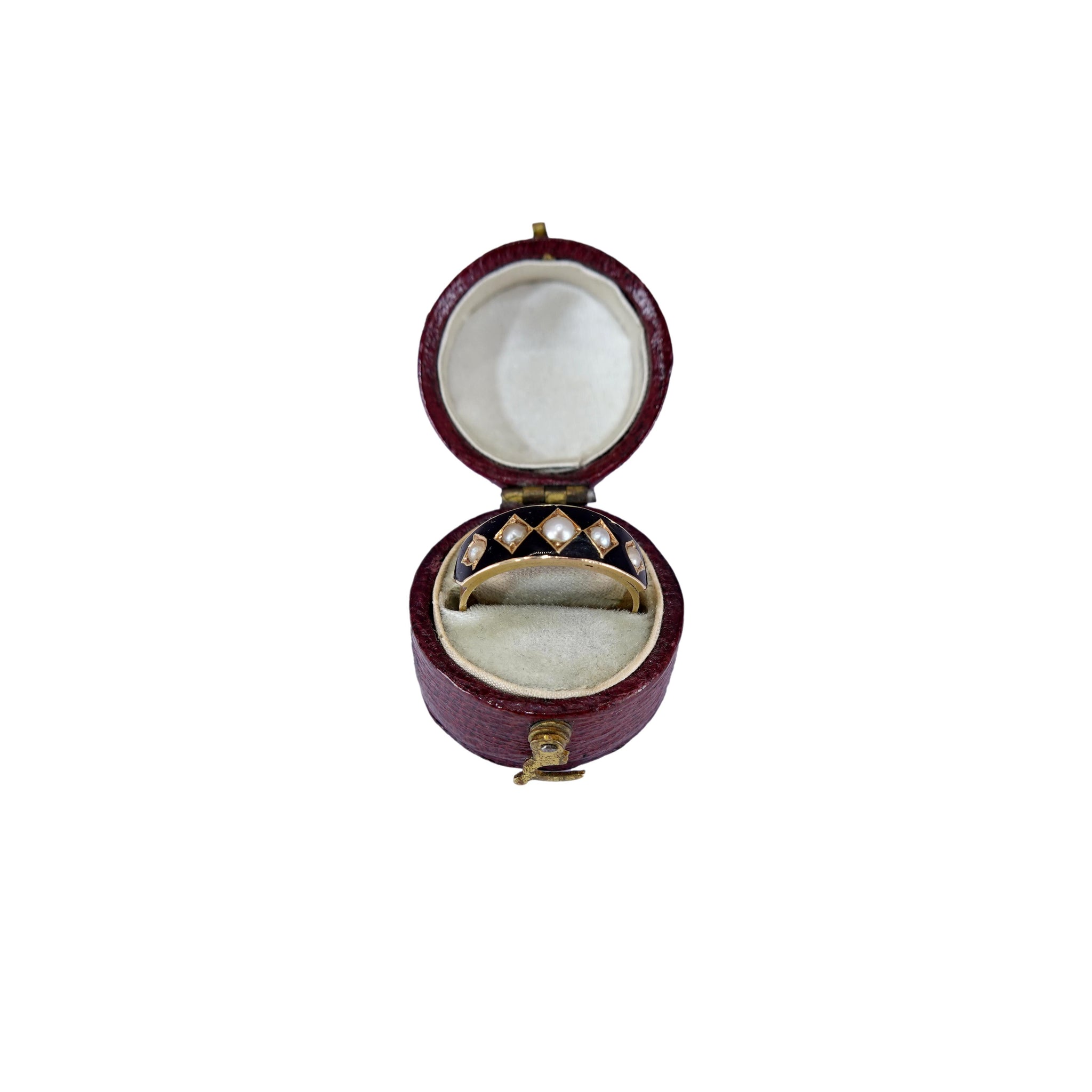 Pearls were traditionally used in mourning jewelry, representing tears and make a beautiful contrast to the black enamel. The ring is fully hallmarked for production in 1879. An elegant and touching piece of wearable jewelry history.