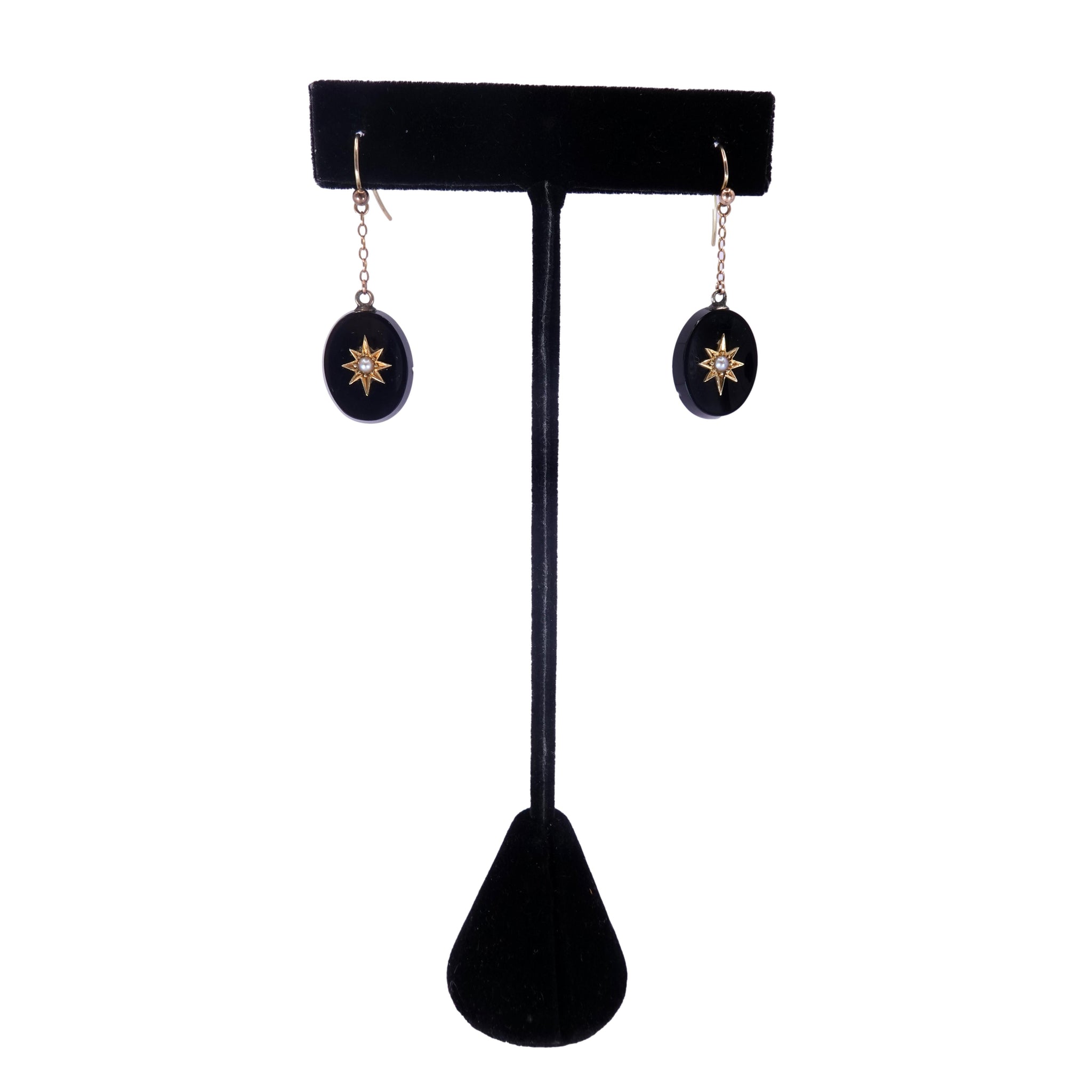 Striking elegance and bold design is highlighted in these impressive authentic vintage Art Deco drop earrings. Made of a polished black onyx with a central starburst setting set with a single split seed pearl all set on a 9k rose gold chain circa 1925-30. Bringing beautiful movement and drama to the wearer they amazingly have a matching ring! Listed separately but message for a special price on both.