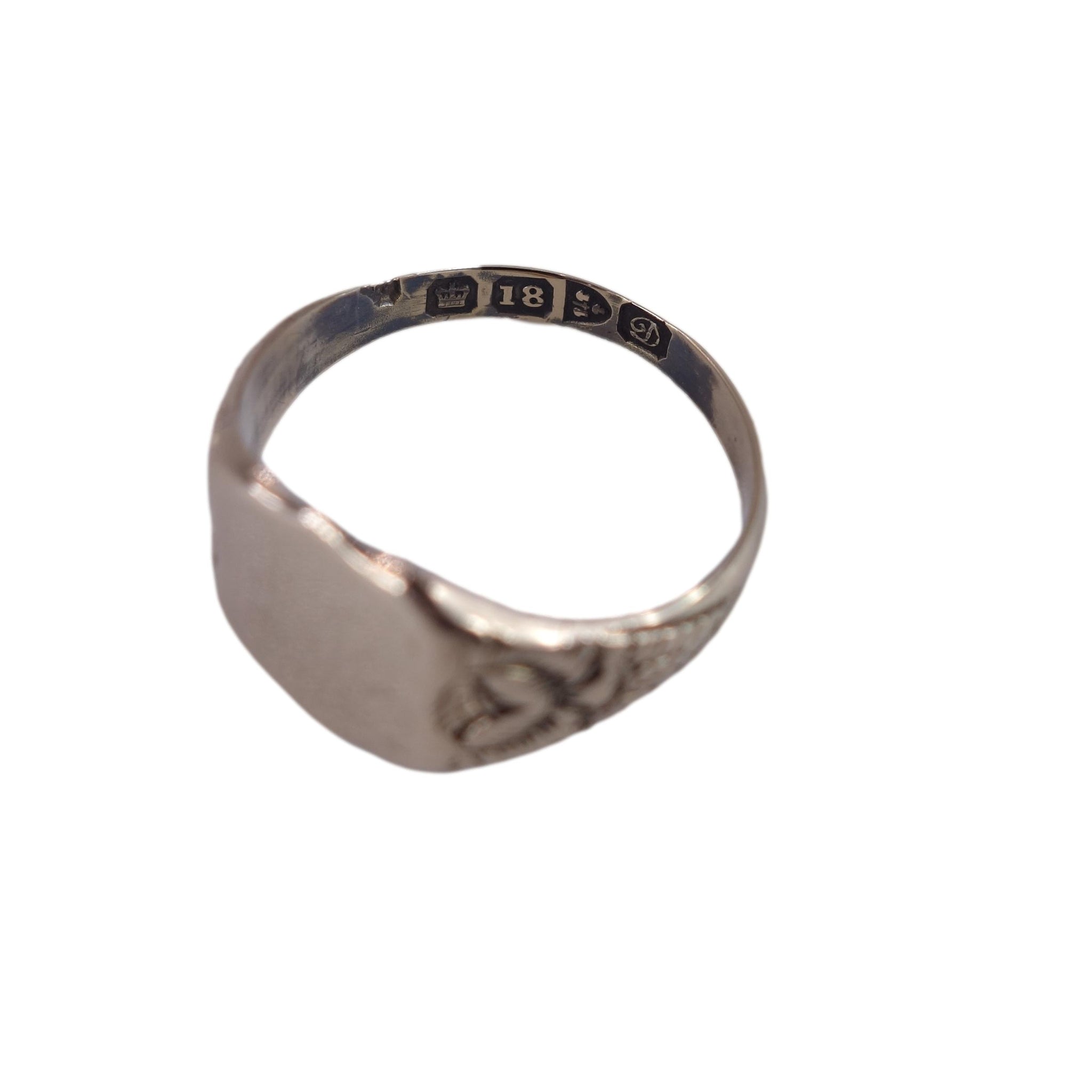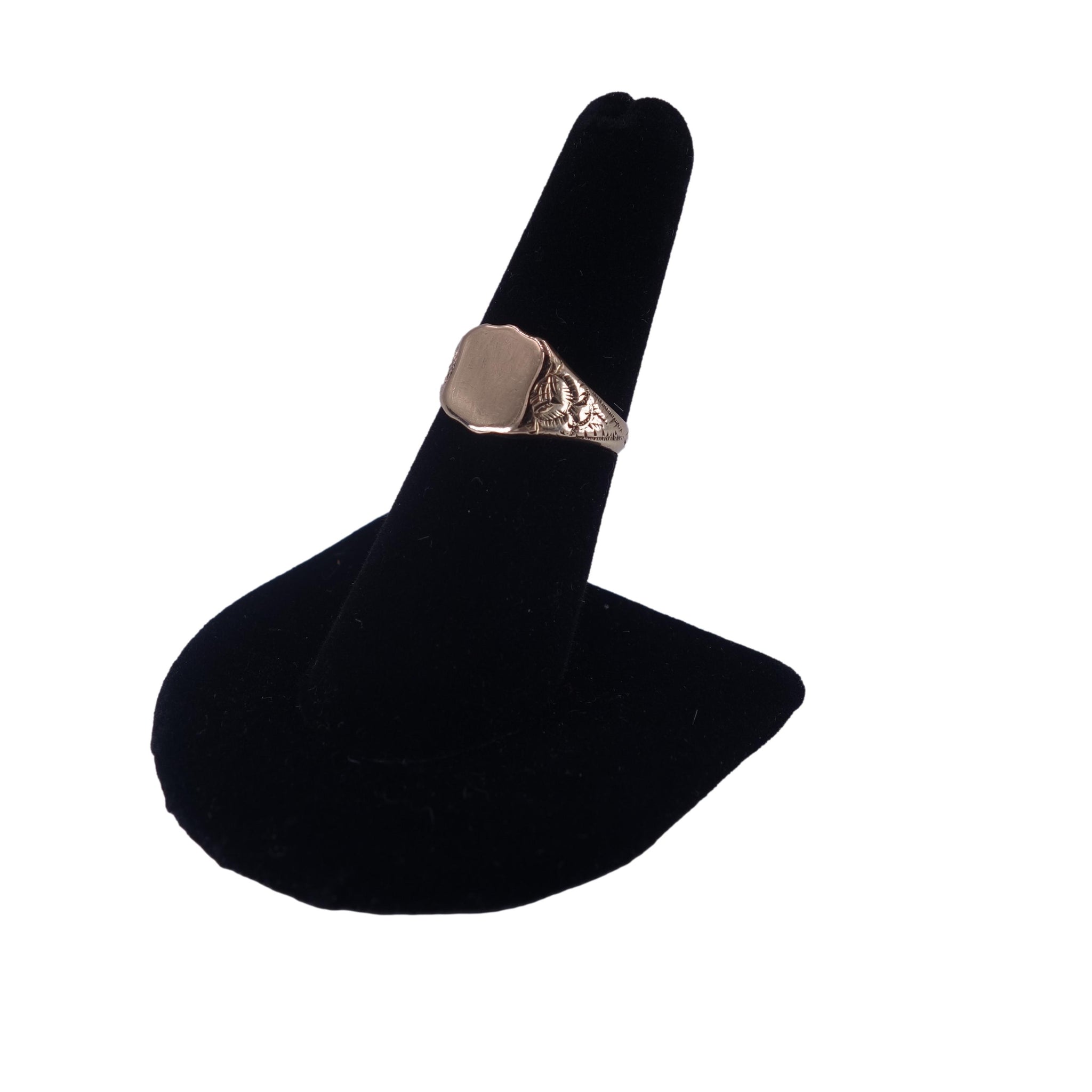 This fully hallmarked 18 karat gold ring was produced in 1903 and features a central shield shaped on a thick warm yellow gold band. Made in the Edwardian era and showing evidence of both Late Victorian and Edwardian design. It has fantastic detailing on the shoulders in a rose pattern. Wonderful unisex style, it is well suited for a man or woman. The shield is blank and vacant.