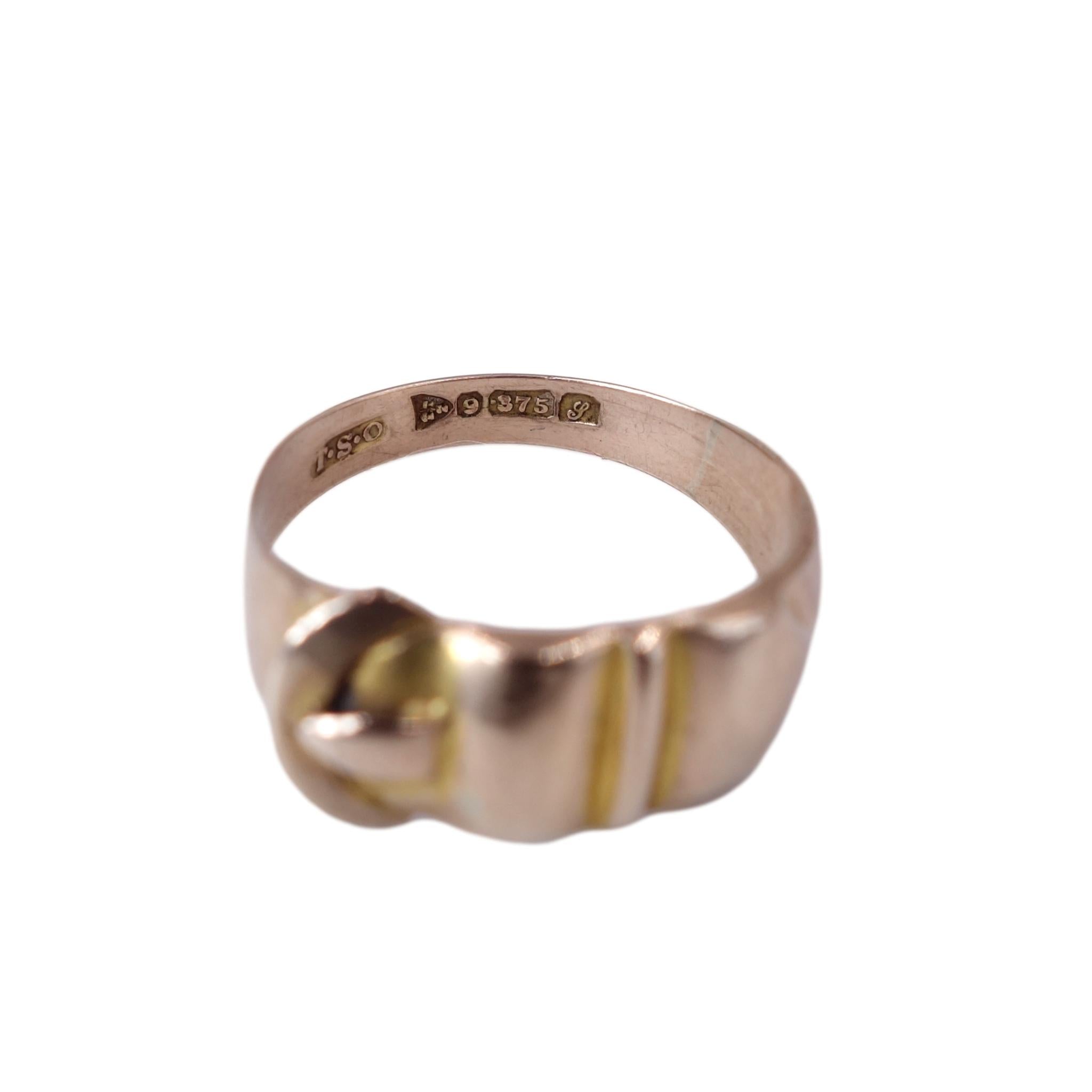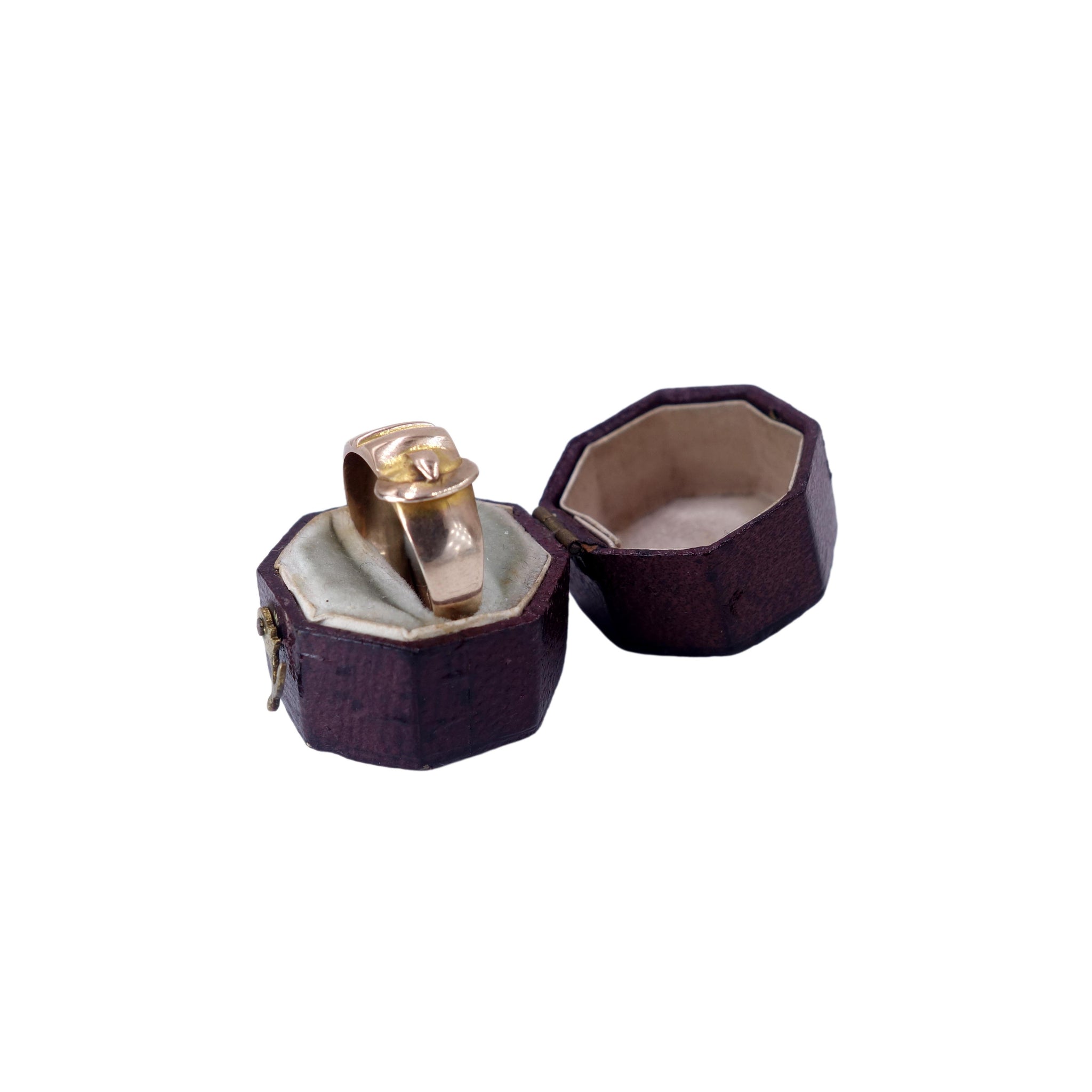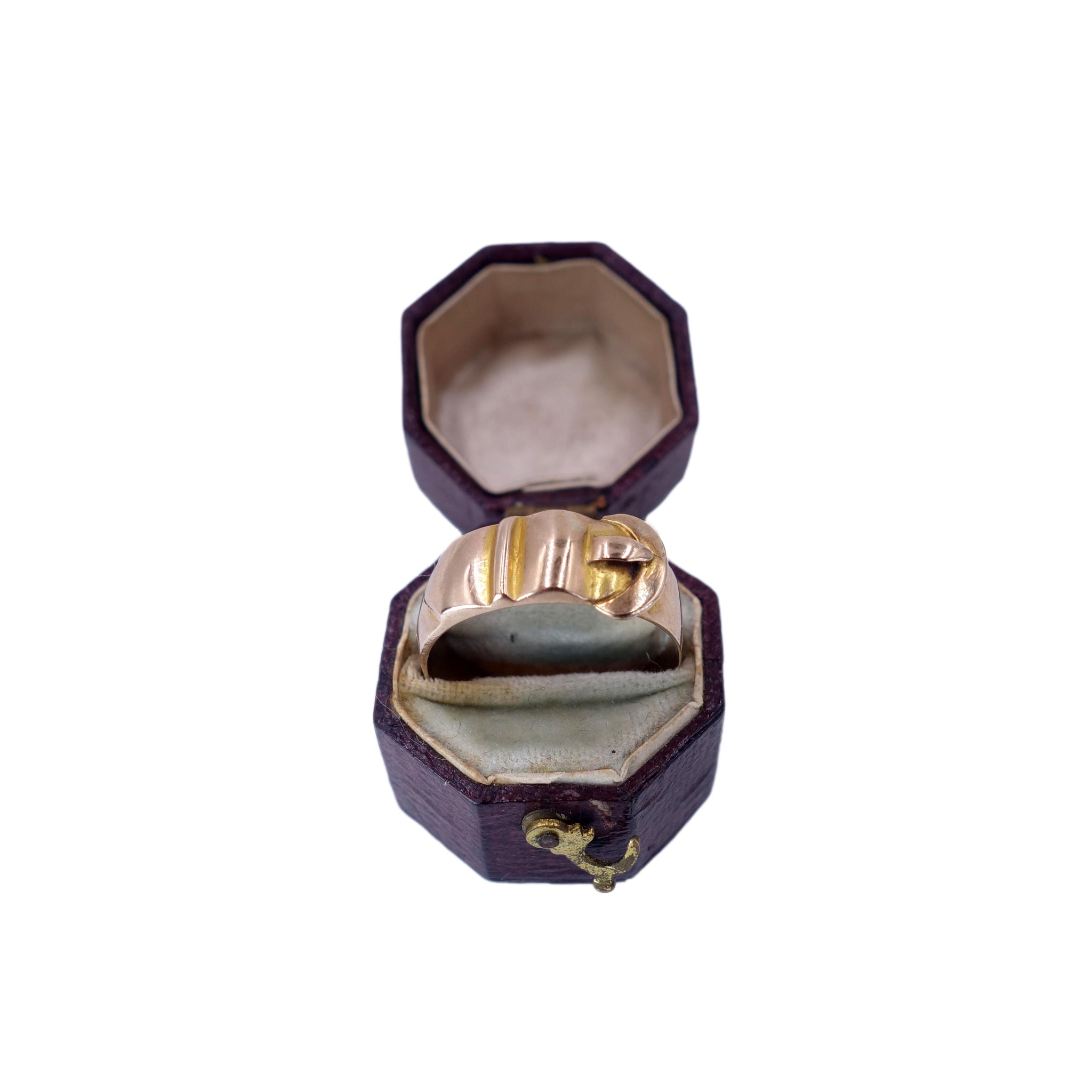 This beautifully simple antique Edwardian ring packs a powerful message. The buckle was a popular motif in Victorian and Edwardian jewelry, found not only in rings, but in bracelets, necklaces and done in gold work and enamel. The buckle was a powerful symbol, representing loyalty, strength and fidelity ,making it associated with marriage and eternity