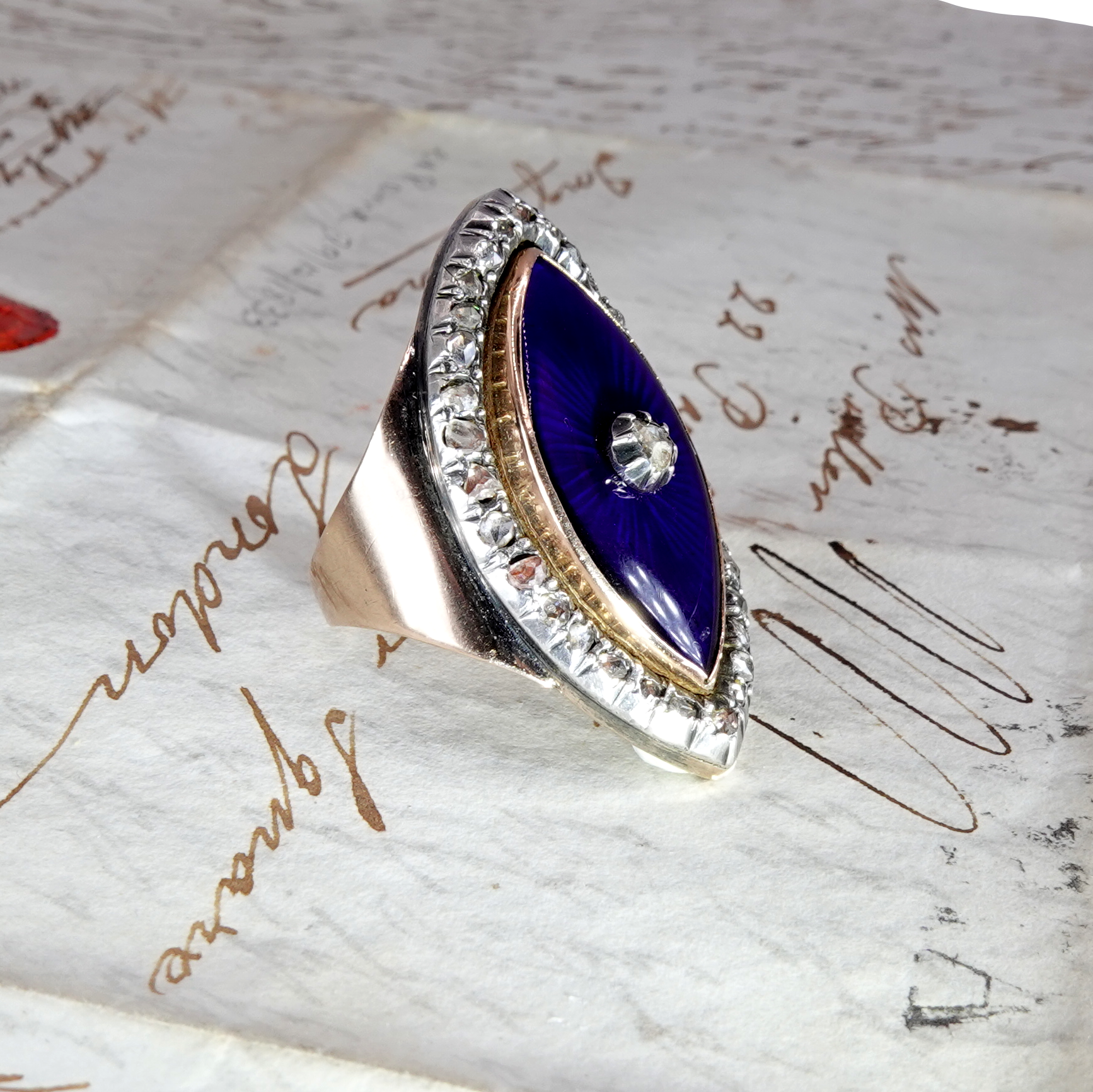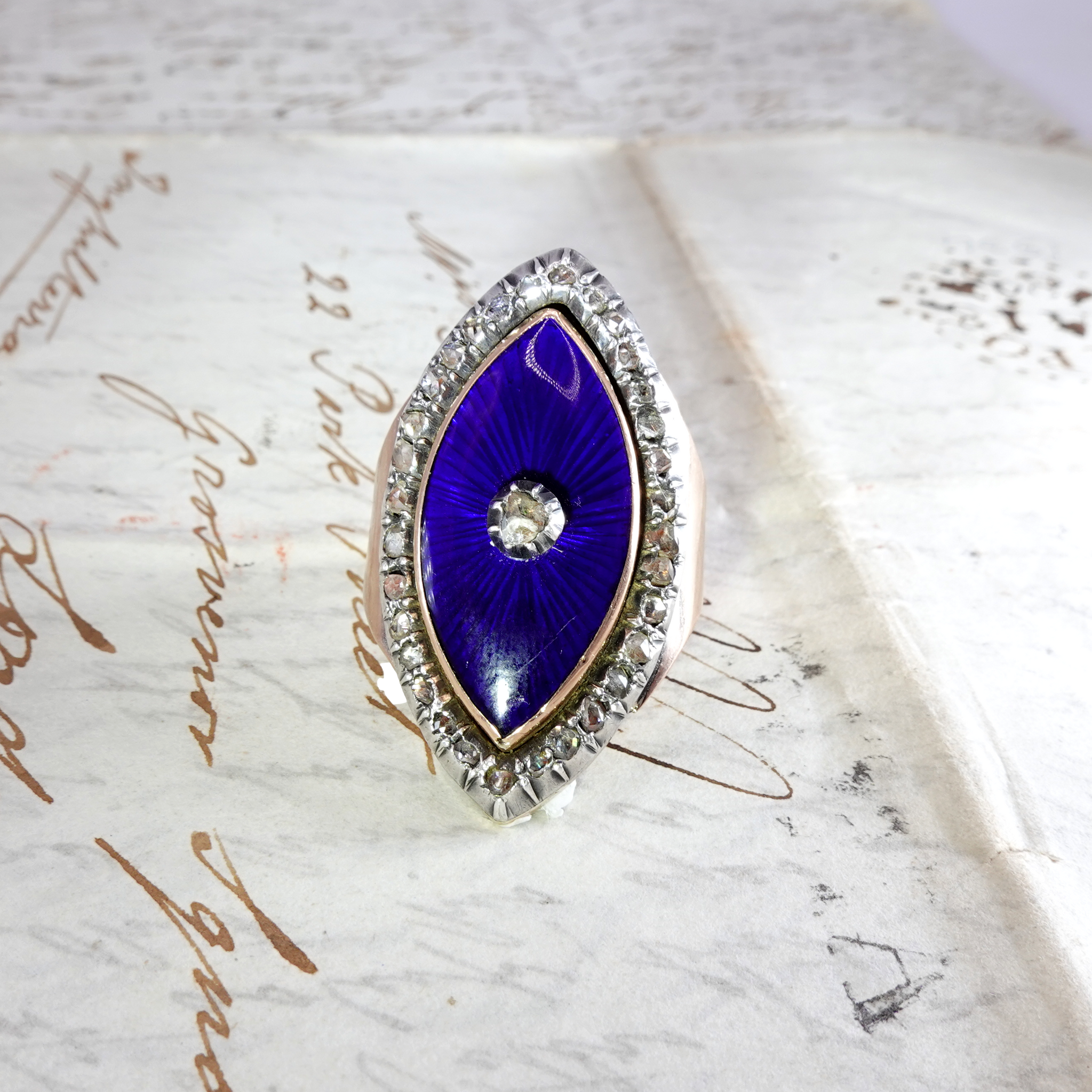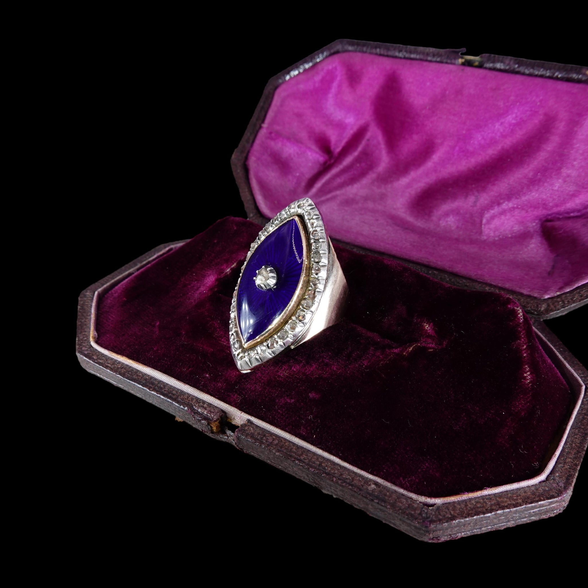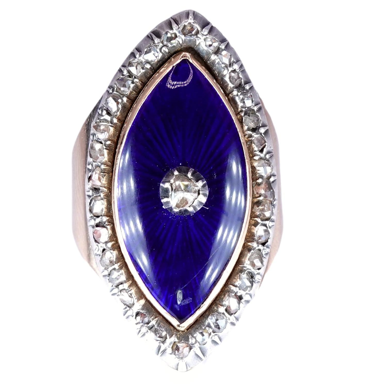 This extraordinary authentic antique ring dates from the late 18th century - circa 1780- and is a beautiful example of Georgian jewelry design. Set with a diamond border containing 32 small rose cut diamonds surrounding a marquise shaped royal blue glass panel set with a central rose cut diamond. Made of a low carat gold- approximately 12k and diamonds set in silver. Beautiful large size.