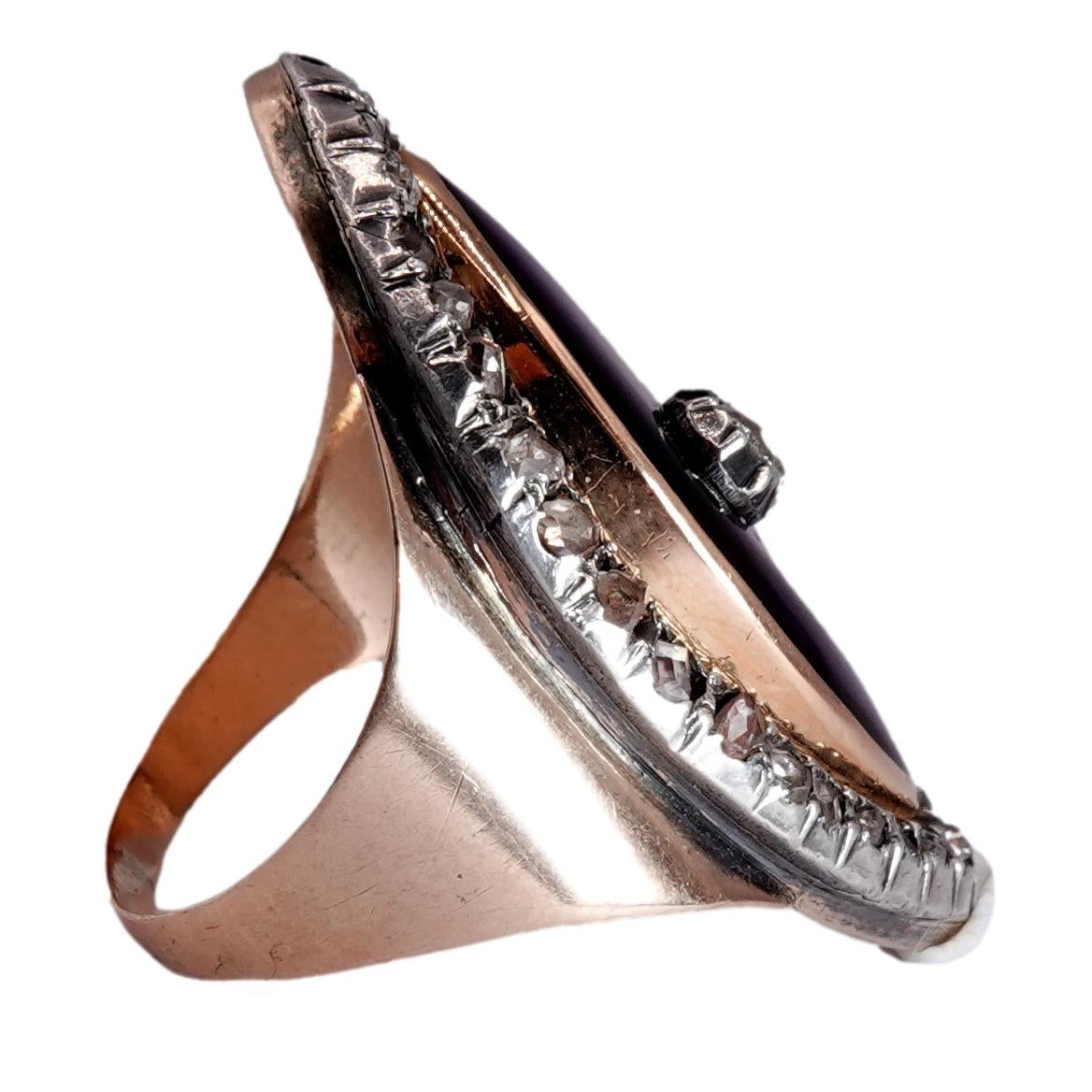 Condition: In very good antique condition. Hairline crack to bottom of the ring glass with small nick visible under magnification. All diamonds present and appear original. Additional photos and videos are available upon request. No sign of resizing on the band. While we do not resize rings we can advise if a ring can be resized.