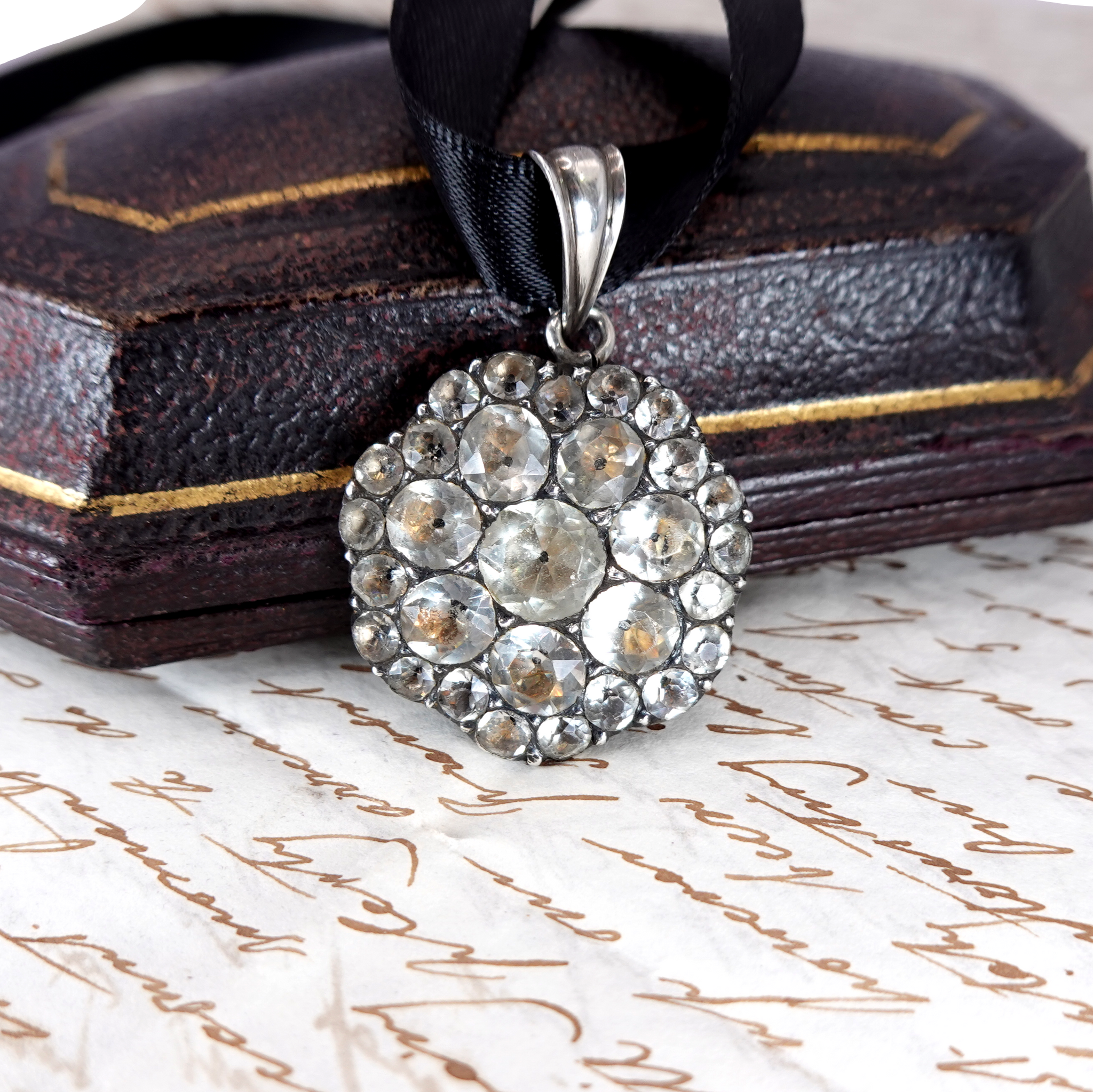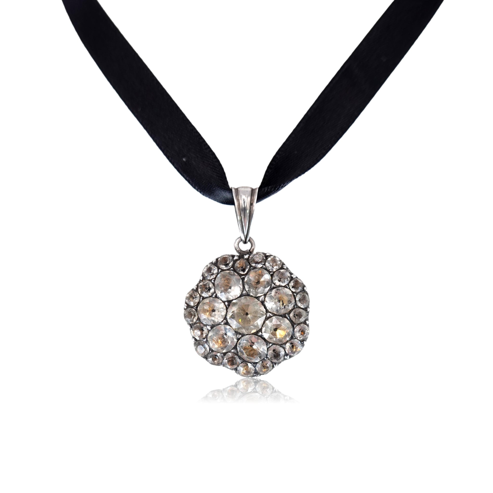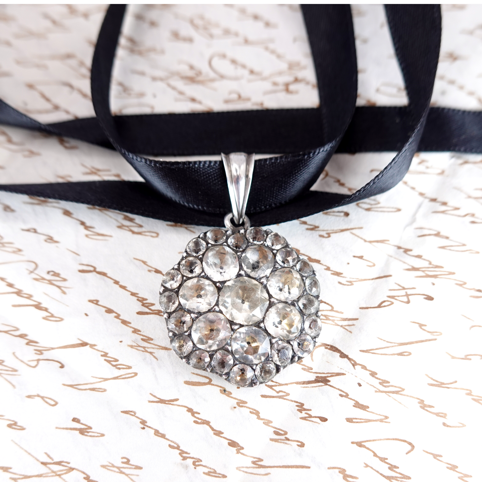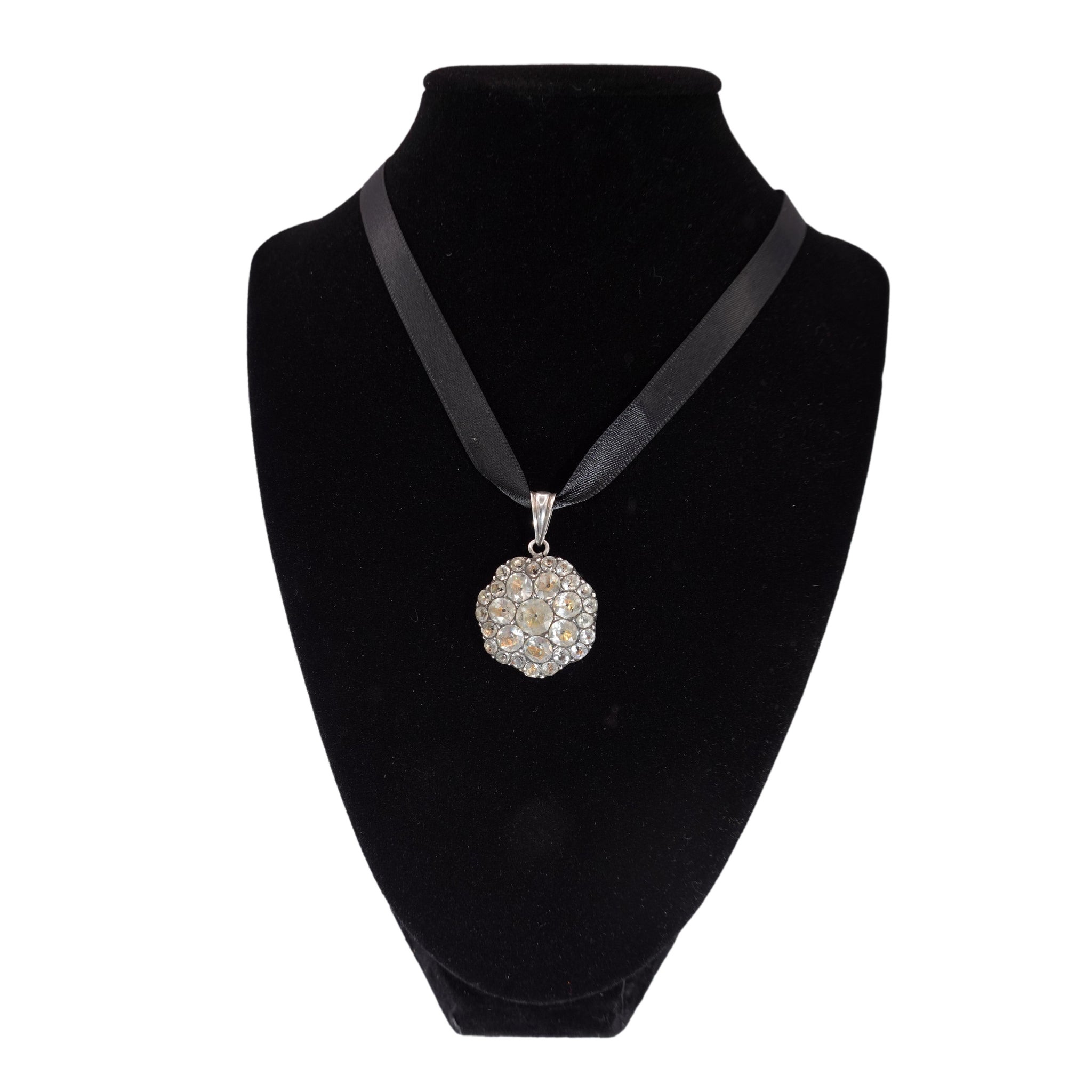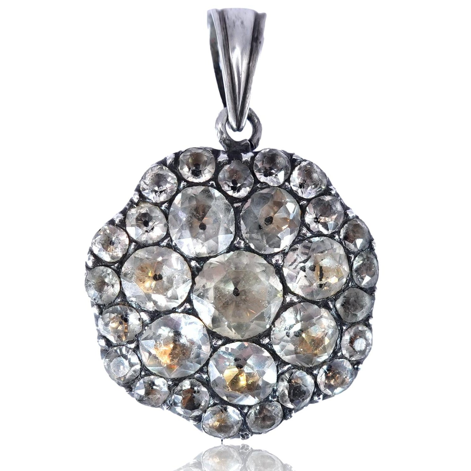A stunning antique pendant that is still wearable today. Most likely converted from an earring or brooch it features numerous paste stones set in silver with a more modern silver bale. Channel 18th Century elegance or give an unforgettable gift for the history lover.