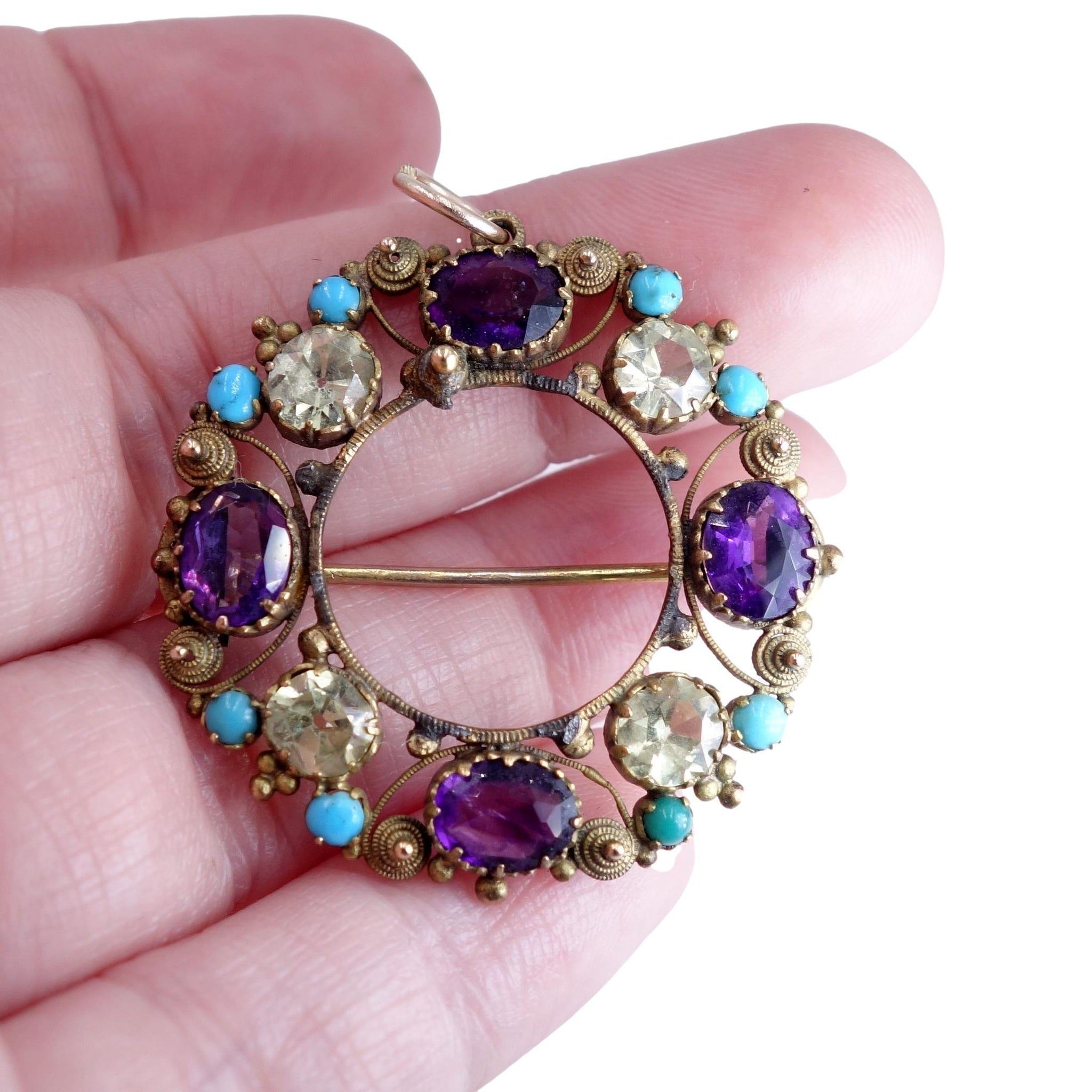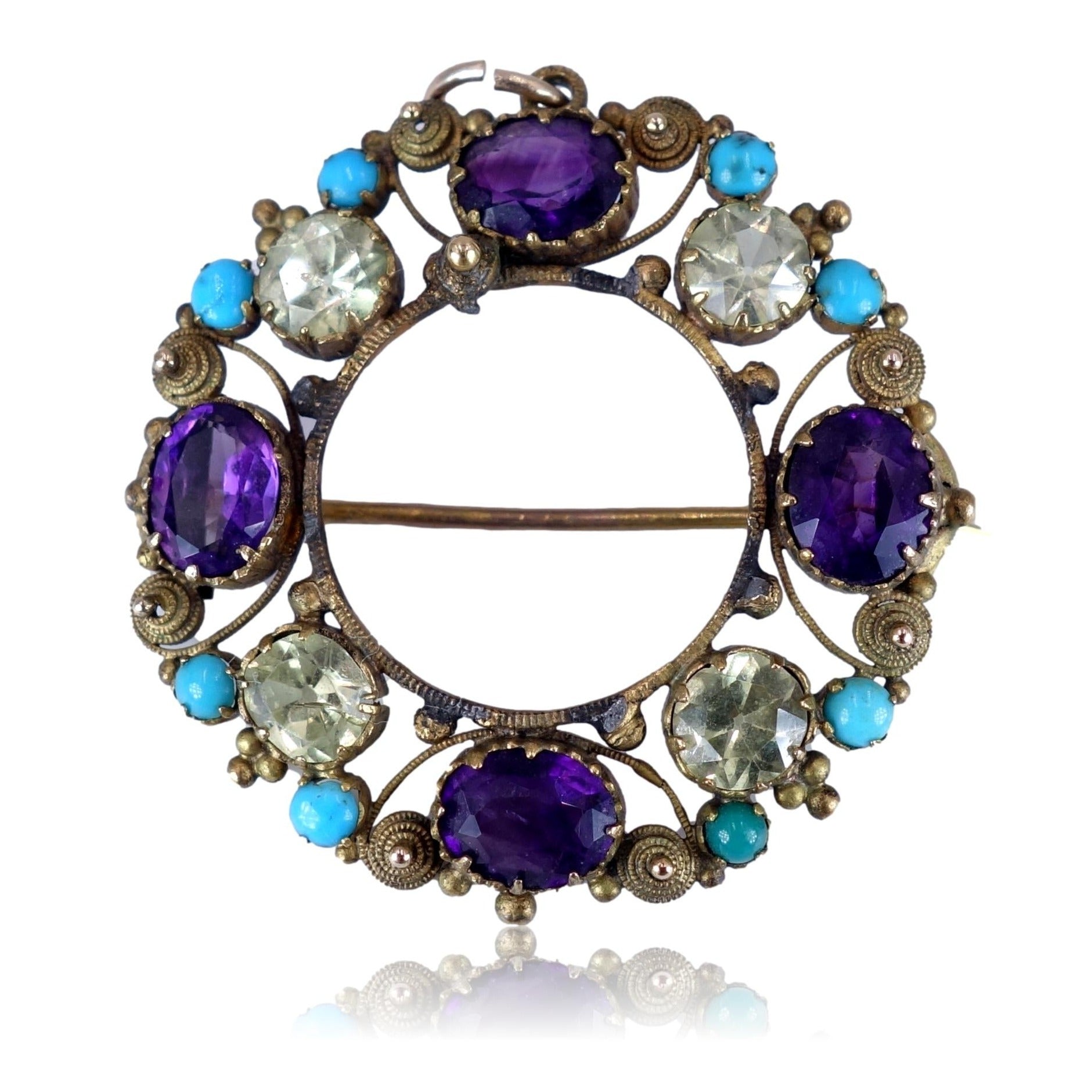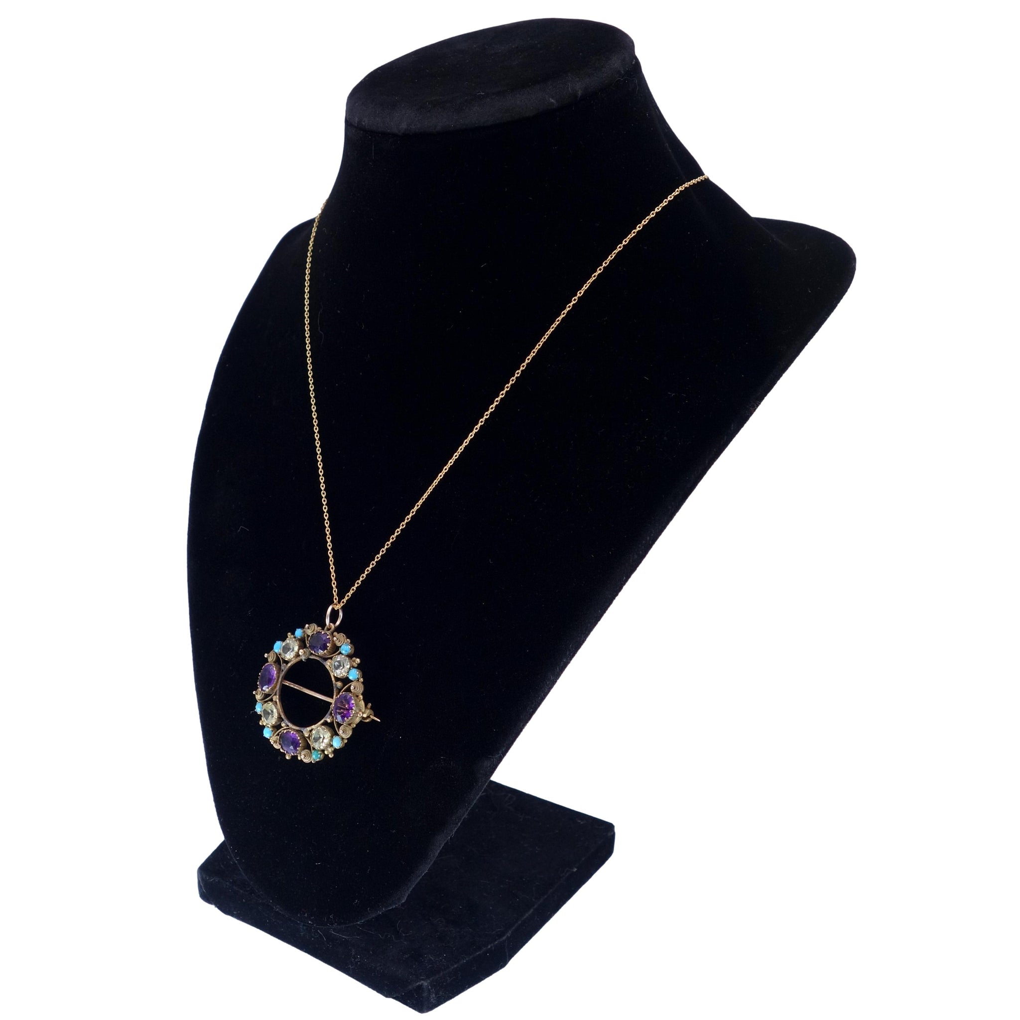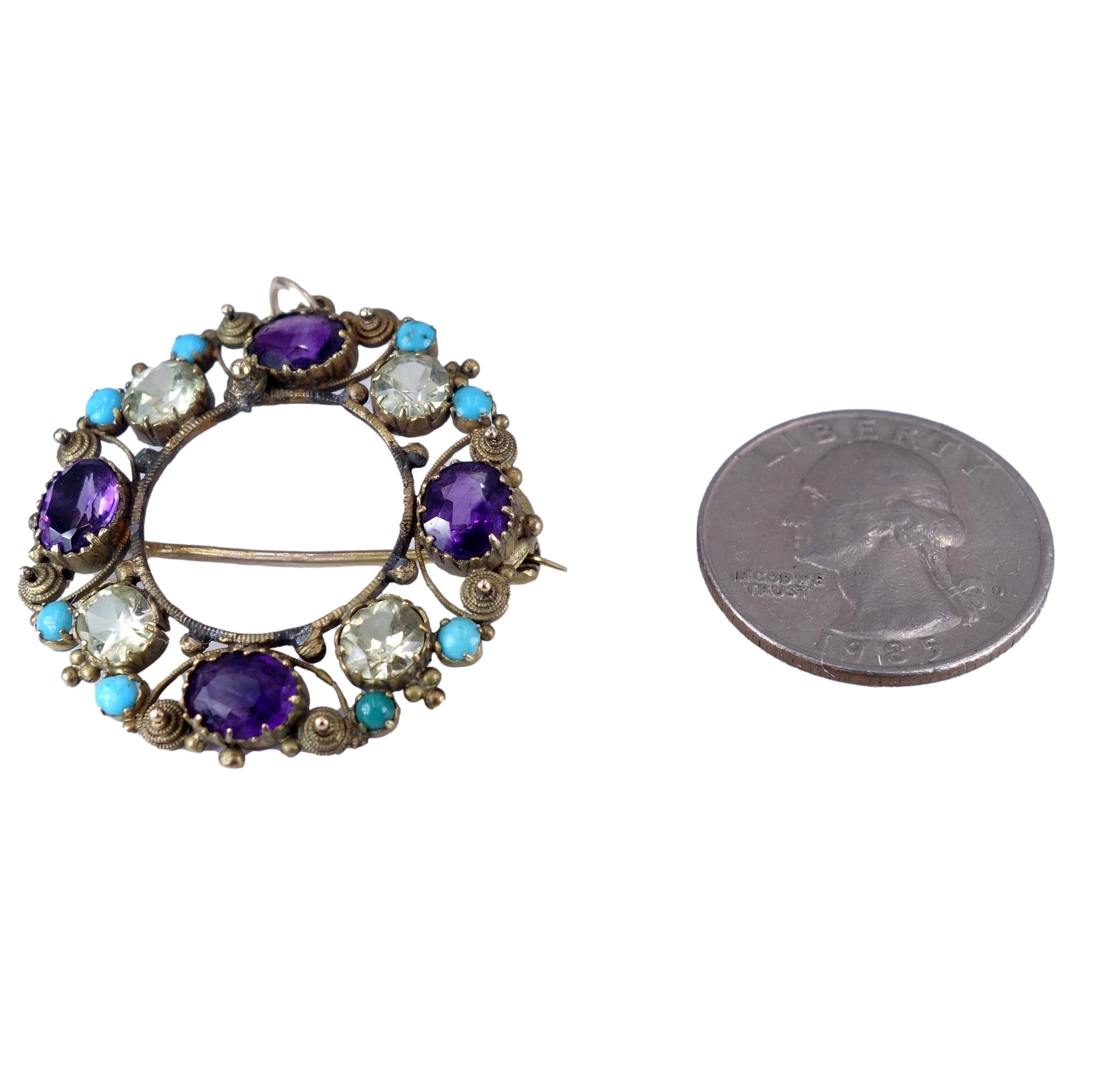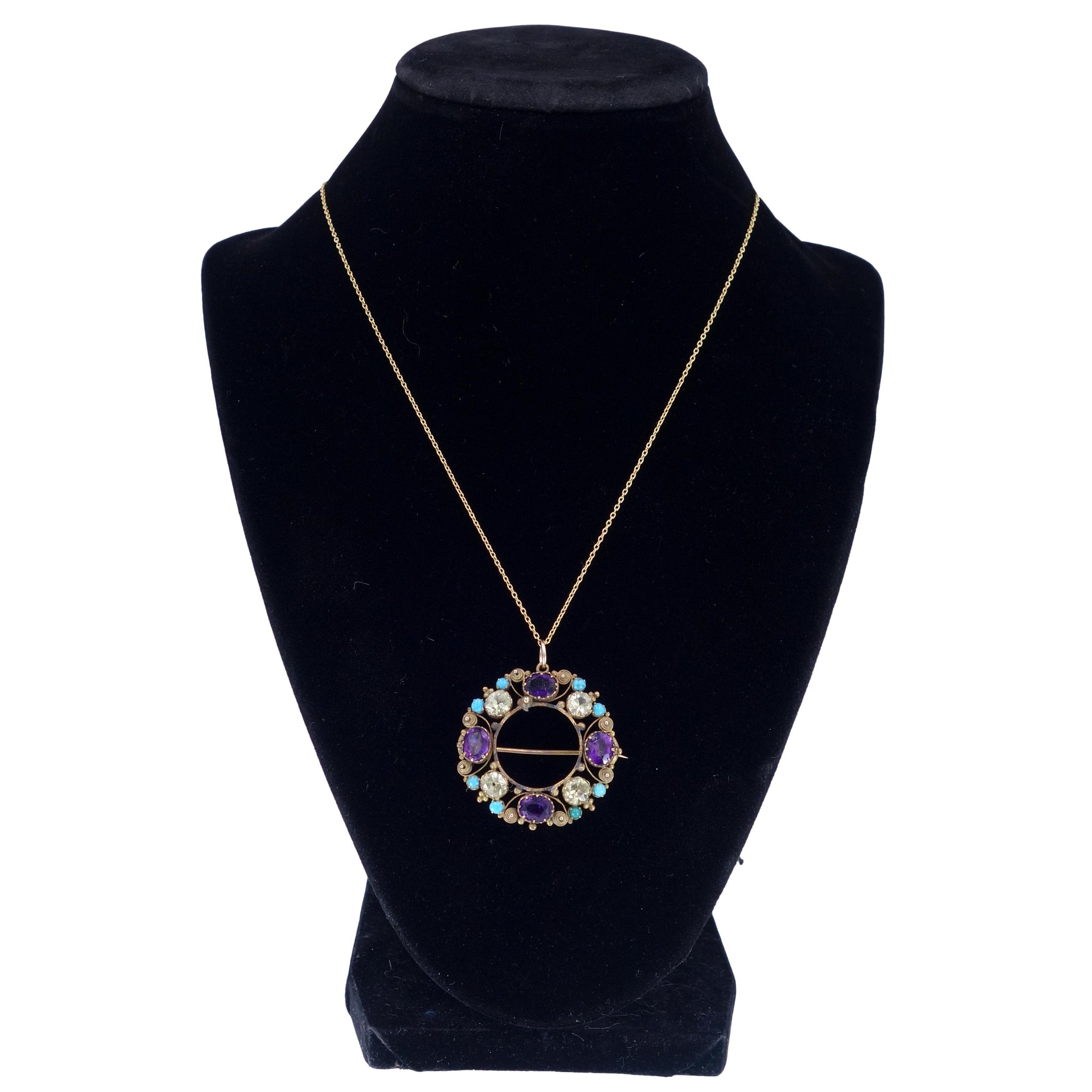 The brooch pendant is set with four oval purple amethysts, four round yellow-green chrysoberyl gems and eight turquoise cabochons in an open back setting.