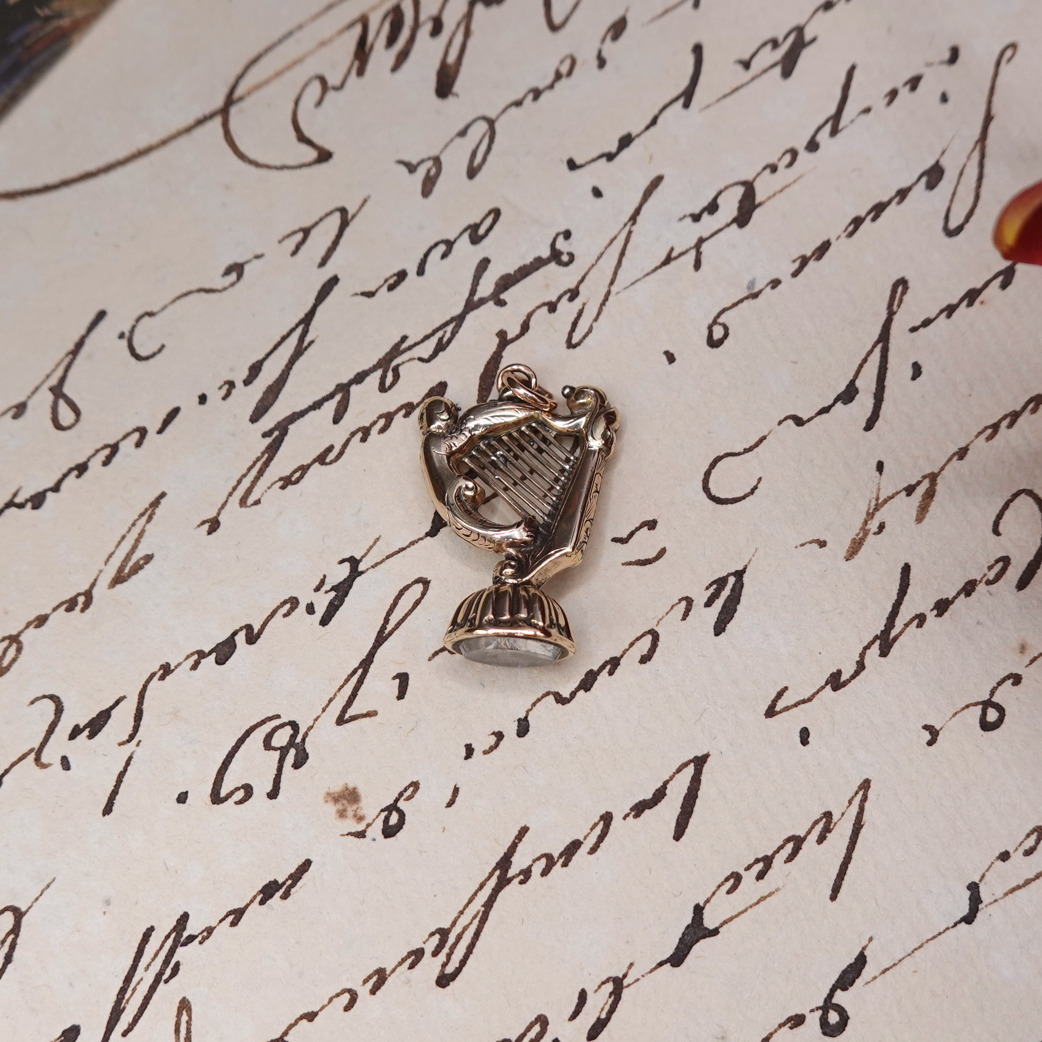 A masterpiece in miniature! The level of detail on this small (less than an inch high!) antique 18th Century gold seal fob (less than an inch high!) is incredible. Beautifully constructed, it features a harp motif with a cherub or angel (with a small face and detailed wings!) on top of a detailed foiled back quartz base. A wonderful example of a Georgian seal fob. Has a small loop at top and can be worn on a chain. Gold plated with approximately 9k yellow gold.