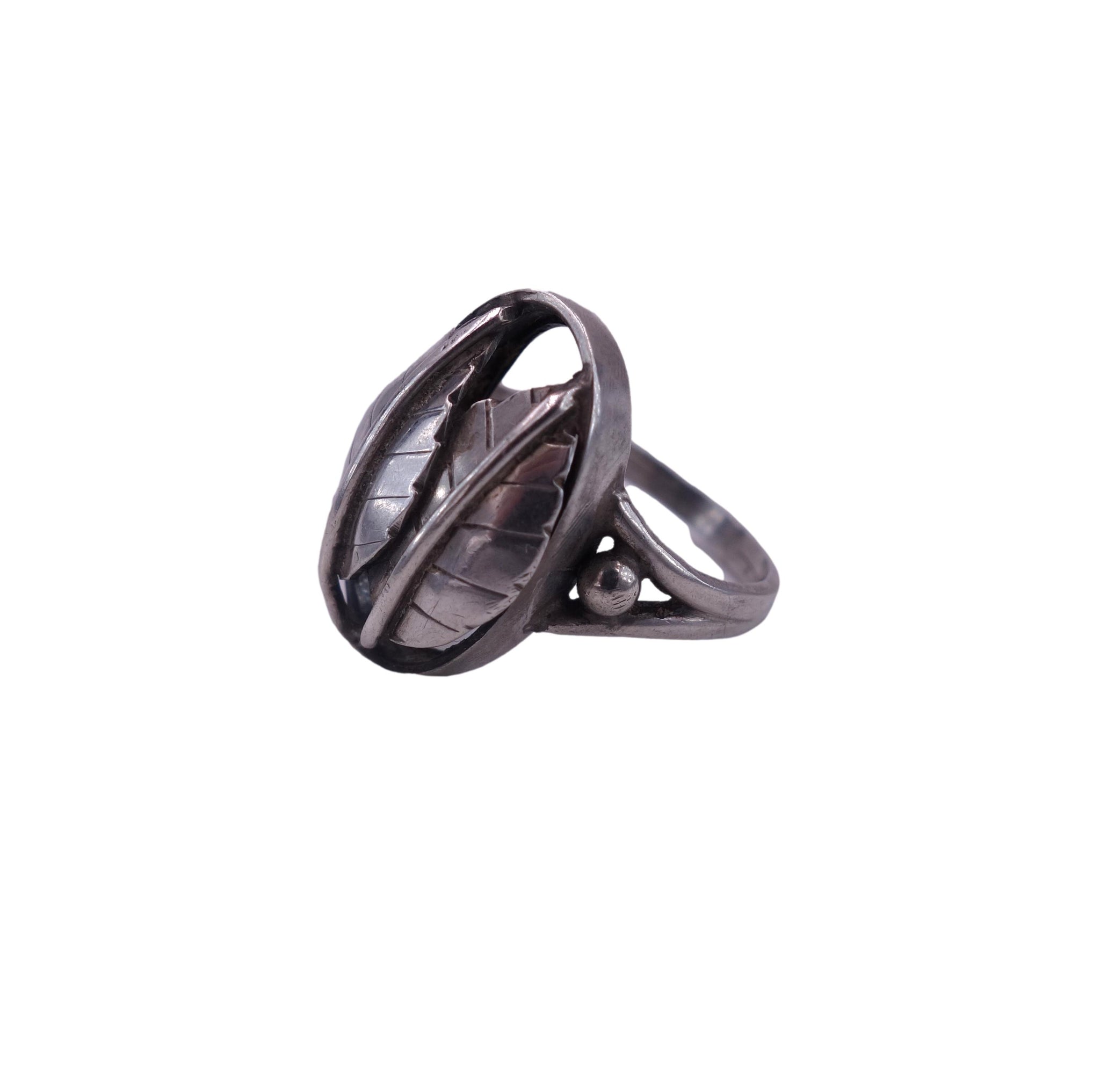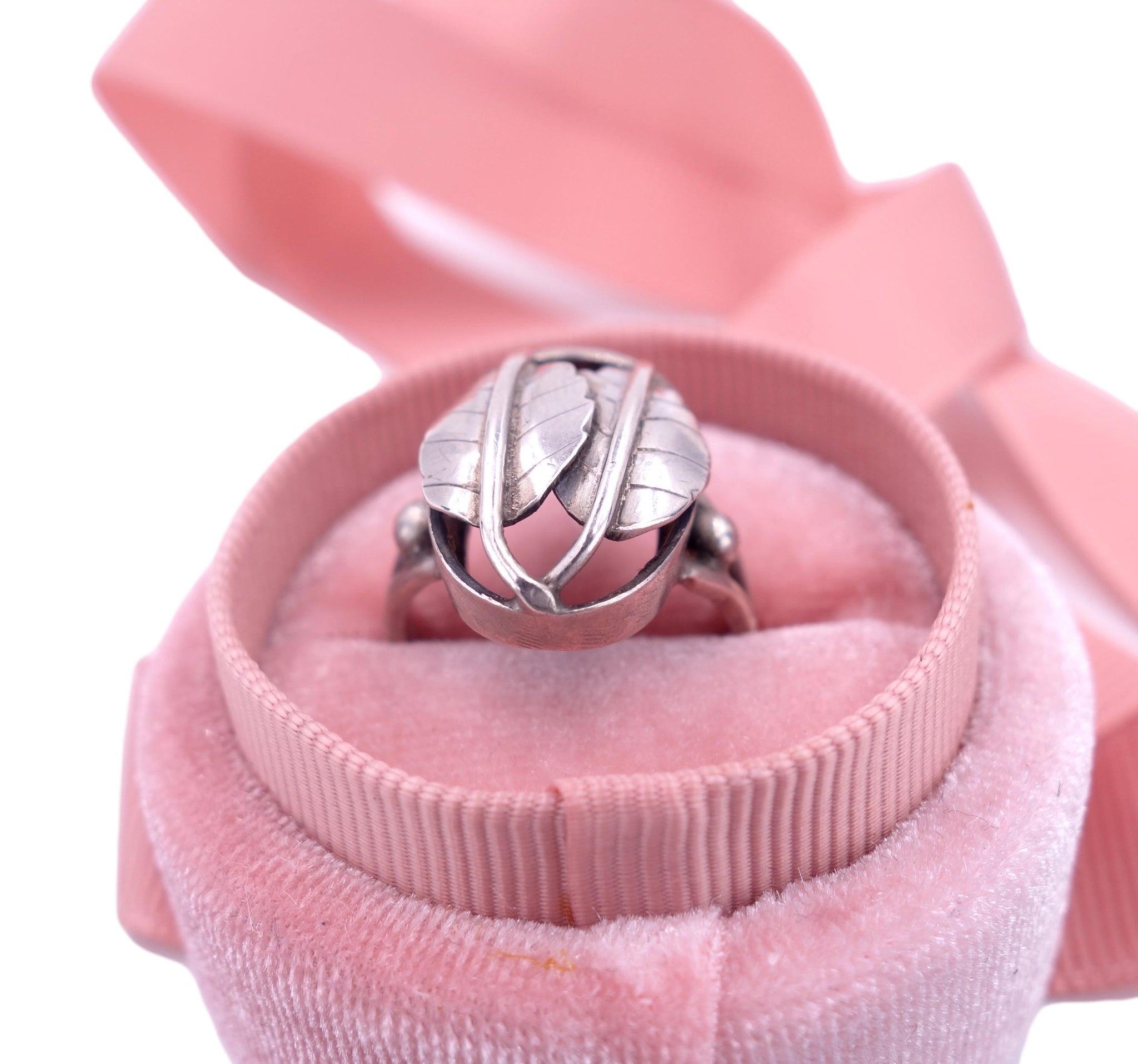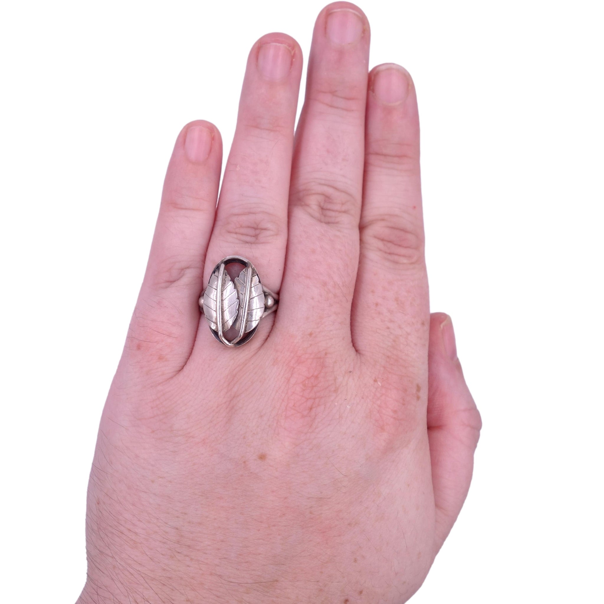 Mid-Century Scandinavian design is highly sought out and collectible for a reason. Clean lines, modern styling and fantastic abstractions are just some of the attributes that are evident in this wonderful fully hallmarked Swedish ring from 1954. Made by the Swedish firm Kaplan of Stockholm it has a stylized leaf pattern on a large striking statement ring.