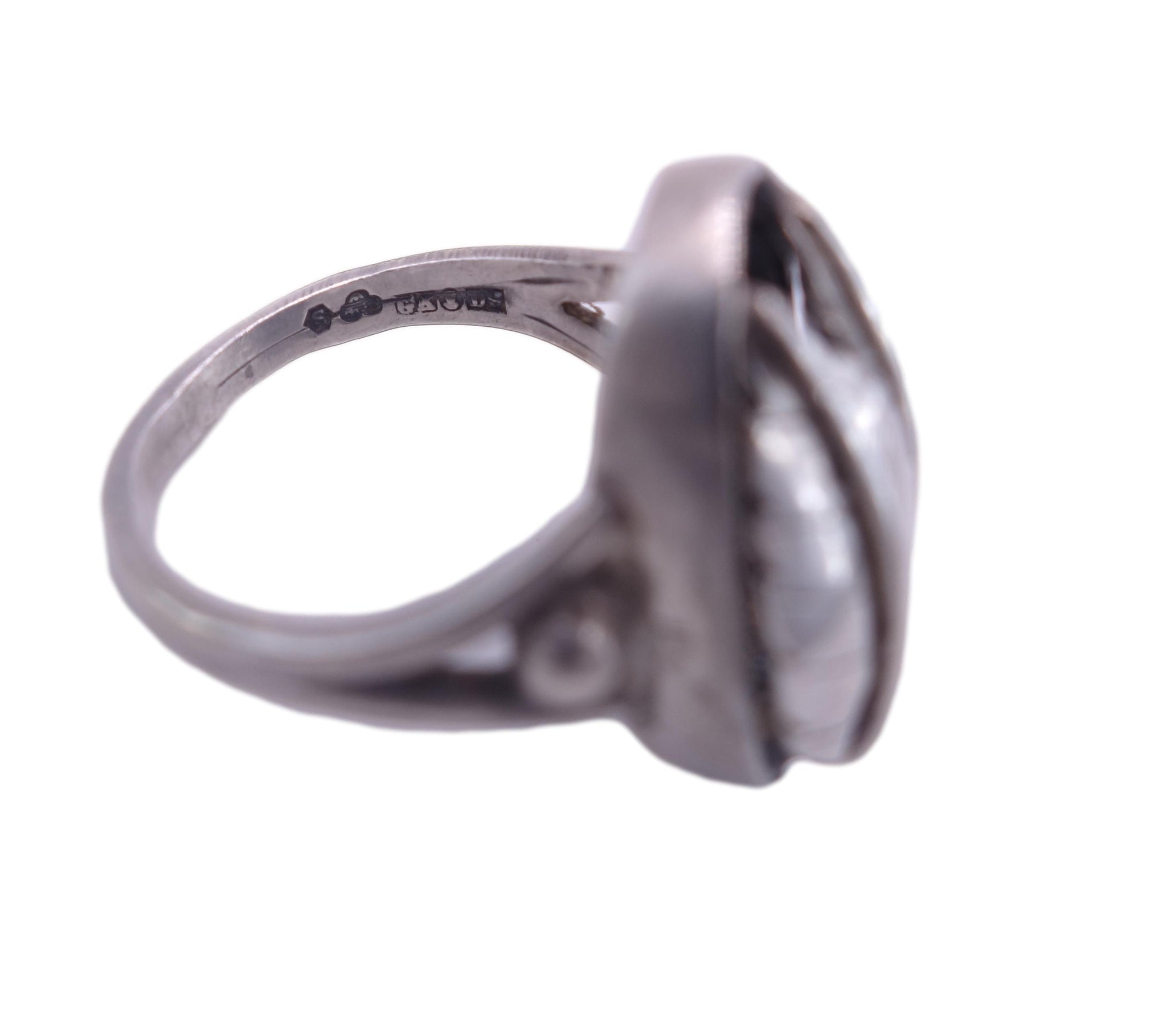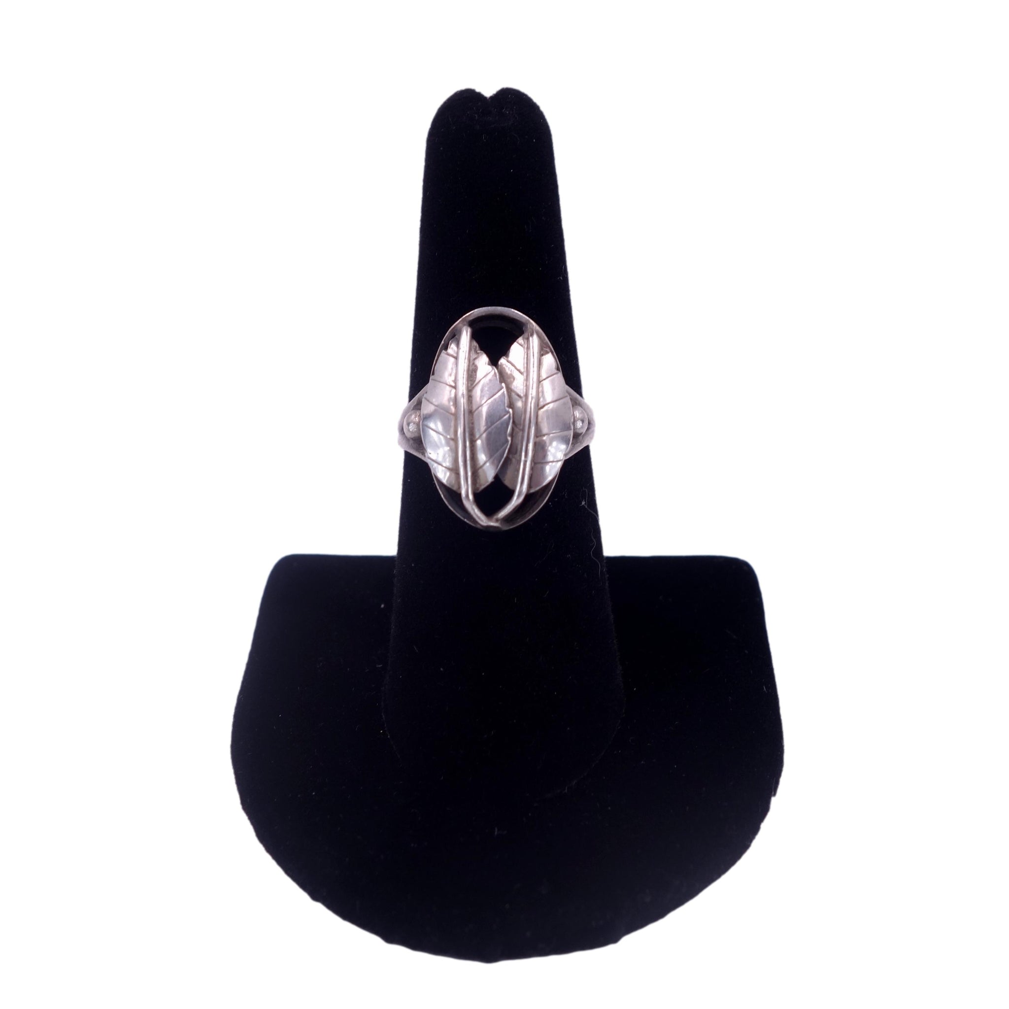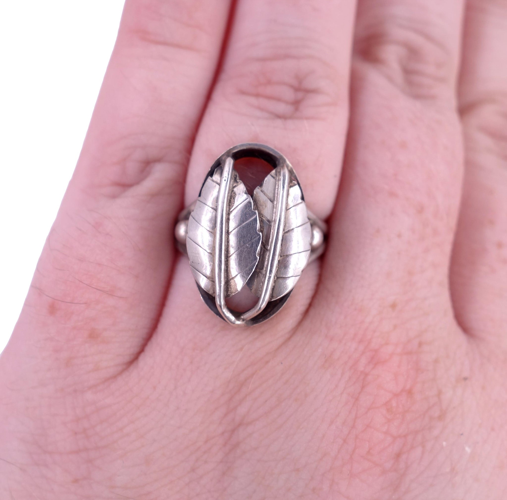 Mid-Century Scandinavian design is highly sought out and collectible for a reason. Clean lines, modern styling and fantastic abstractions are just some of the attributes that are evident in this wonderful fully hallmarked Swedish ring from 1954. Made by the Swedish firm Kaplan of Stockholm it has a stylized leaf pattern on a large striking statement ring.