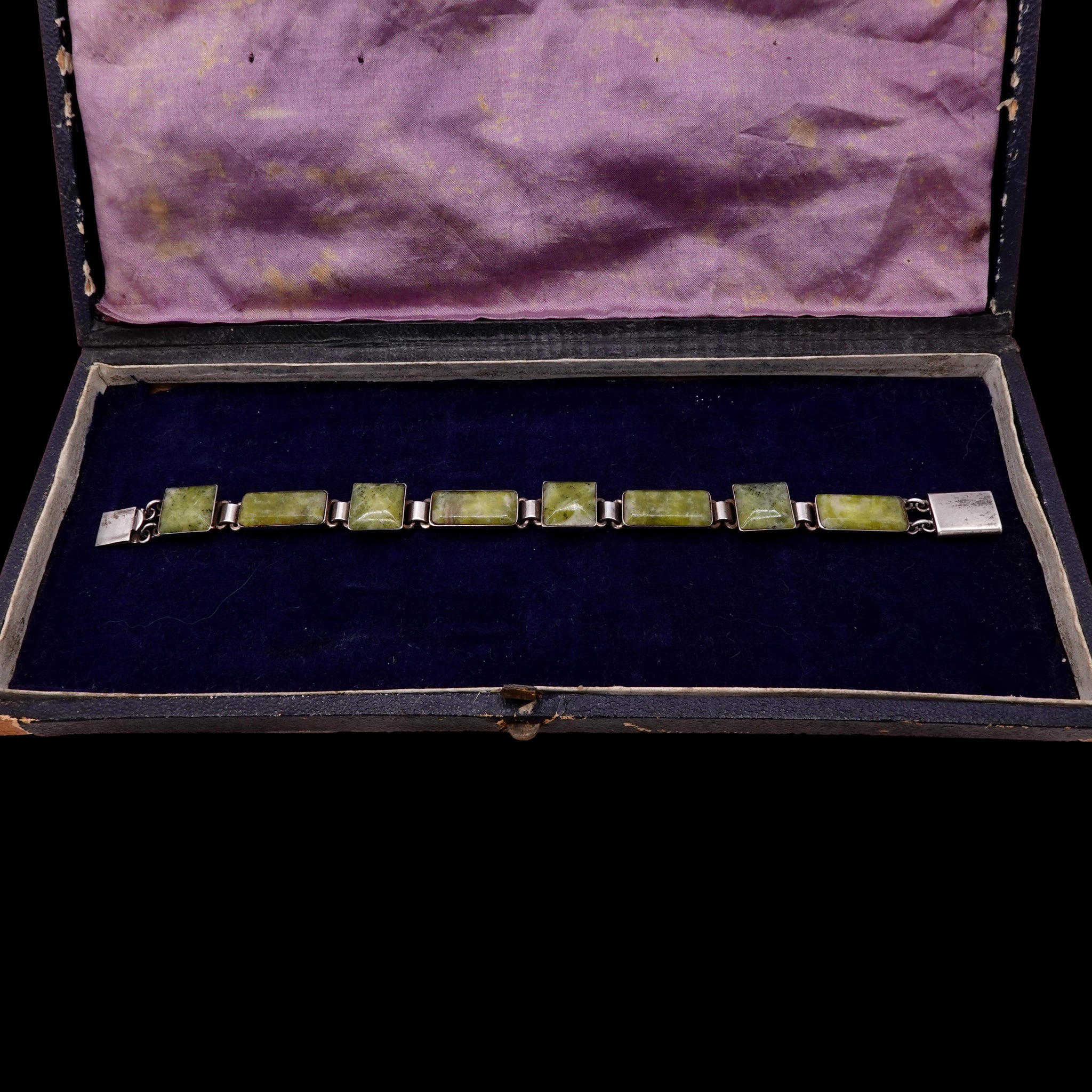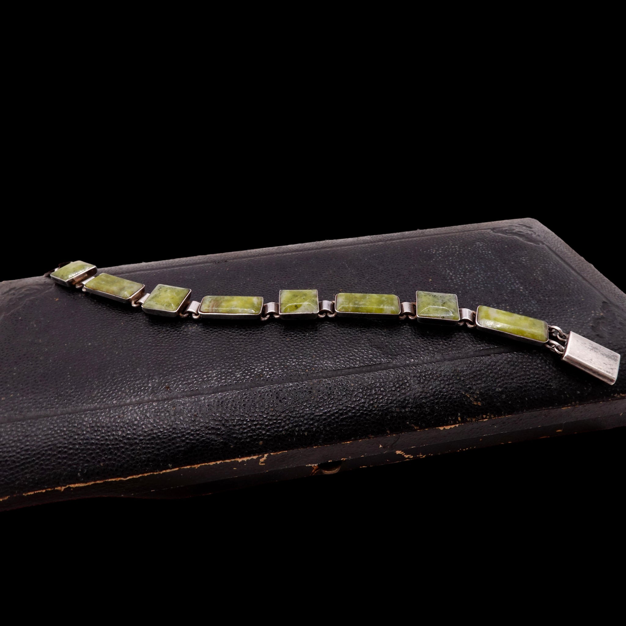 Connemara marble is one of the rarest marbles in the world. Known as the "Irish gemstone" it has been mined in the County Galway since the early 19th Century. A beautiful varied green in color, reflecting the Irish landscape. This beautiful example takes this uniquely Irish material and marries to the mid-century modern style. Fully hallmarked for production in Dublin in 1959 it features alternating square and rectangular flexible links (all marked) set in marked 925 silver.