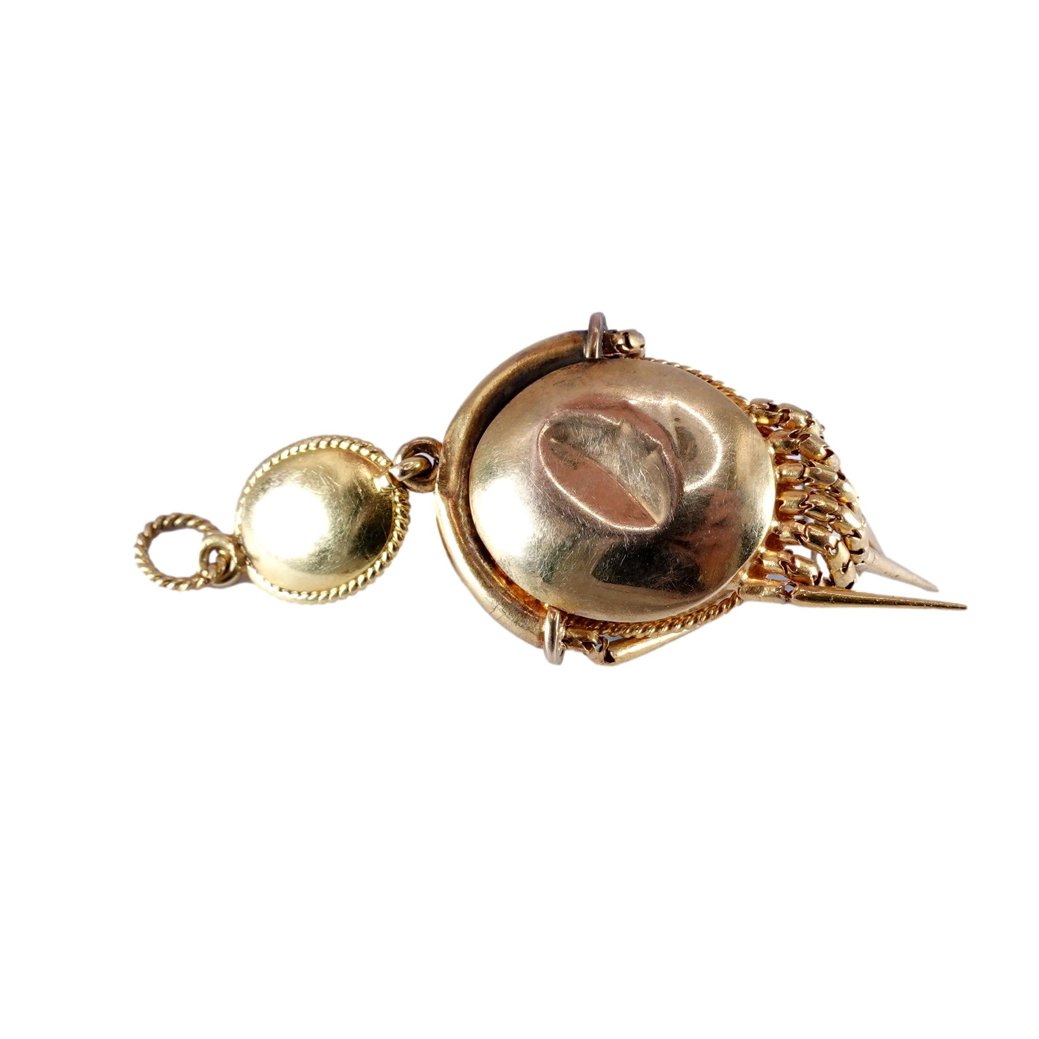 Condition: In good antique condition. Large dent to reverse as seen in photo - does not affect wearability or integrity of the piece. One tassel has been repaired and is no longer articulated. Bale and upper section most likely later addition. Turquoise are not set in gold and interior fittings are unknown. Minor wear to some turquoise. Additional photos and videos are available upon request.