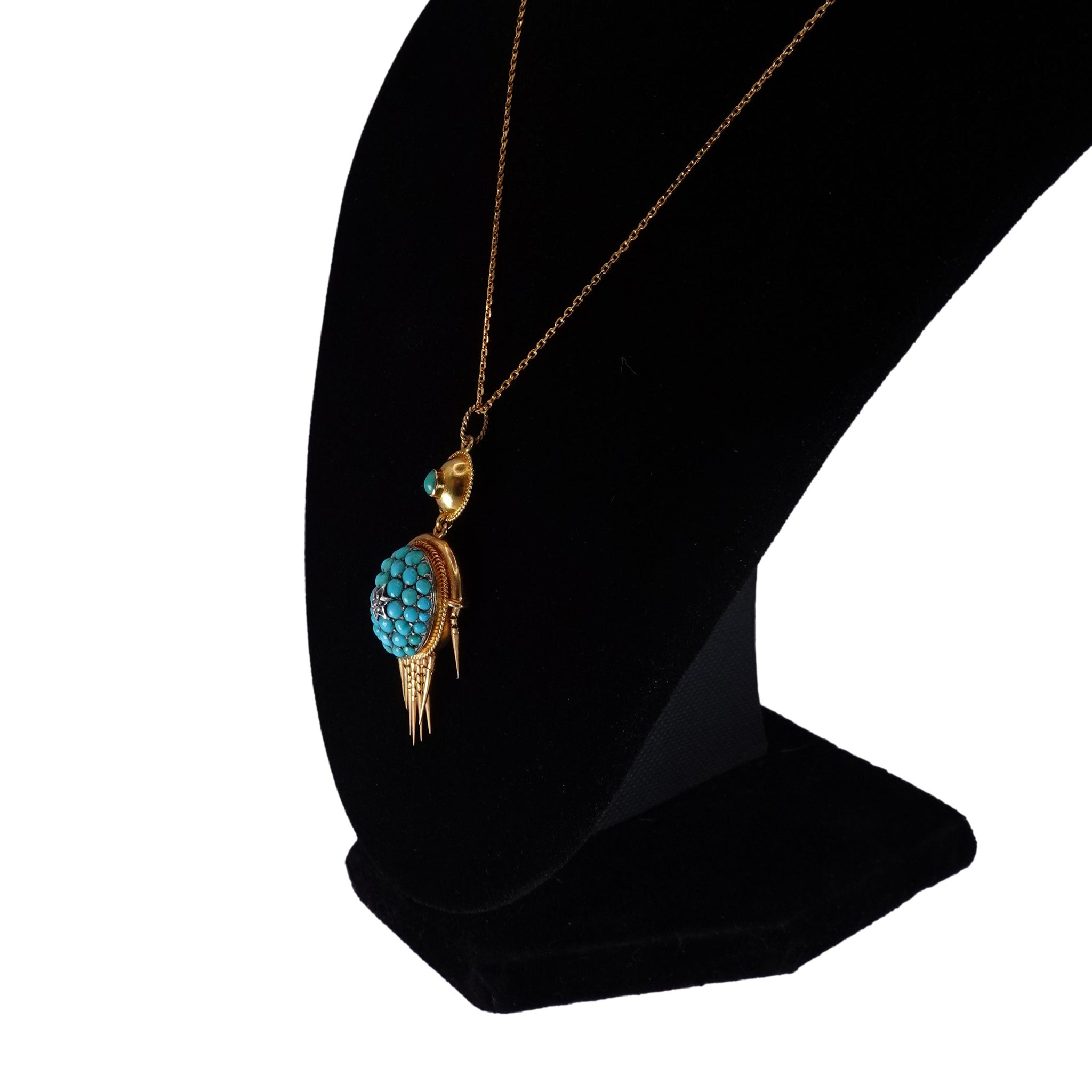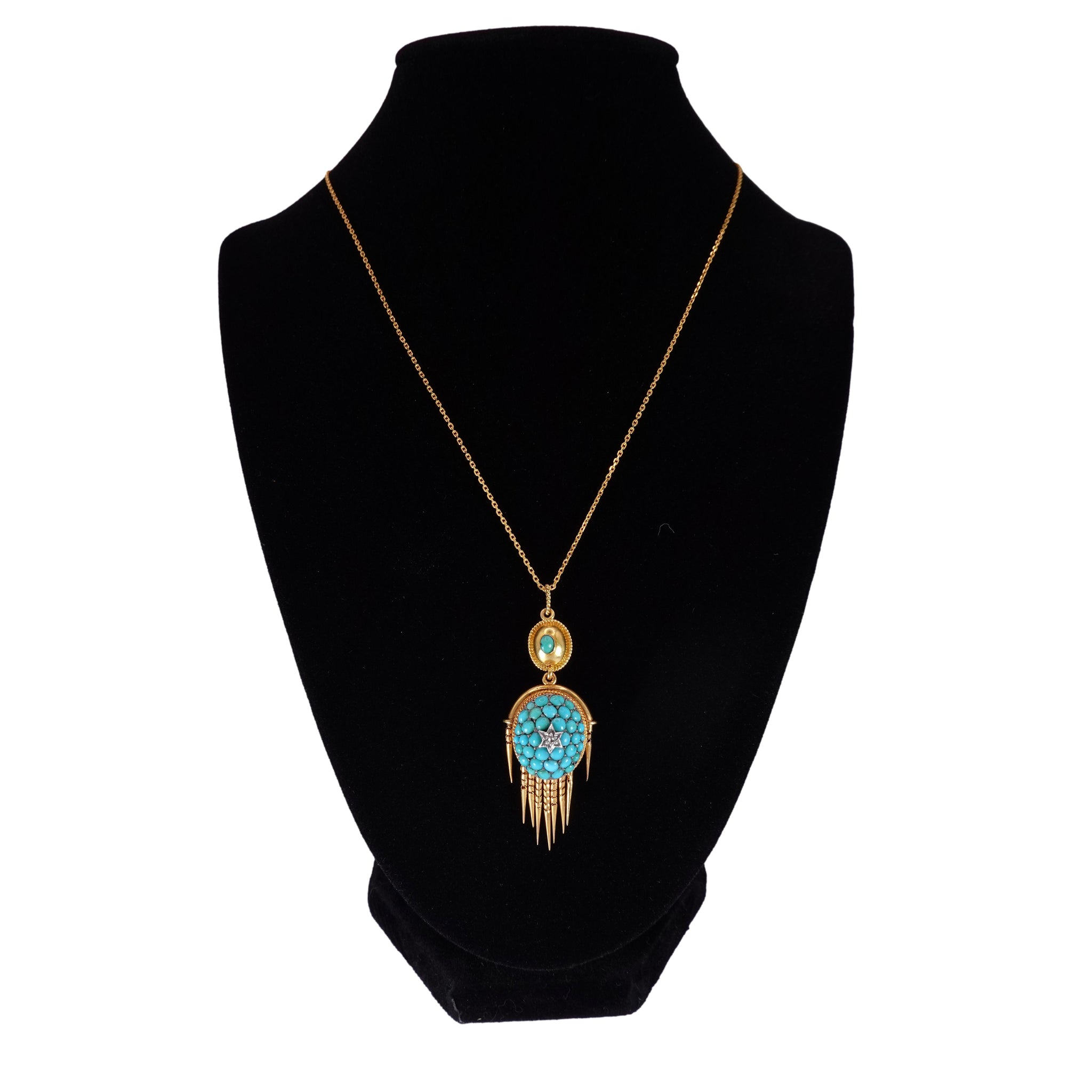 A stunning masterpiece of 19th Century Victorian design! This authentic antique pendant dates from the mid 1800s most likely circa 1860-70 with some later additions. Crafted of 18k yellow gold and silver and set with beautiful bombe pave set turquoise cabochons surrounding a central silver star setting around a small white diamond. Suspended from this is nine articulated flexible gold tassels (one has been repaired and is no longer mobile). This entire piece is suspended from a later but matching 18k gold setting with a single turquoise cabochon with 14k yellow gold twisted bale.