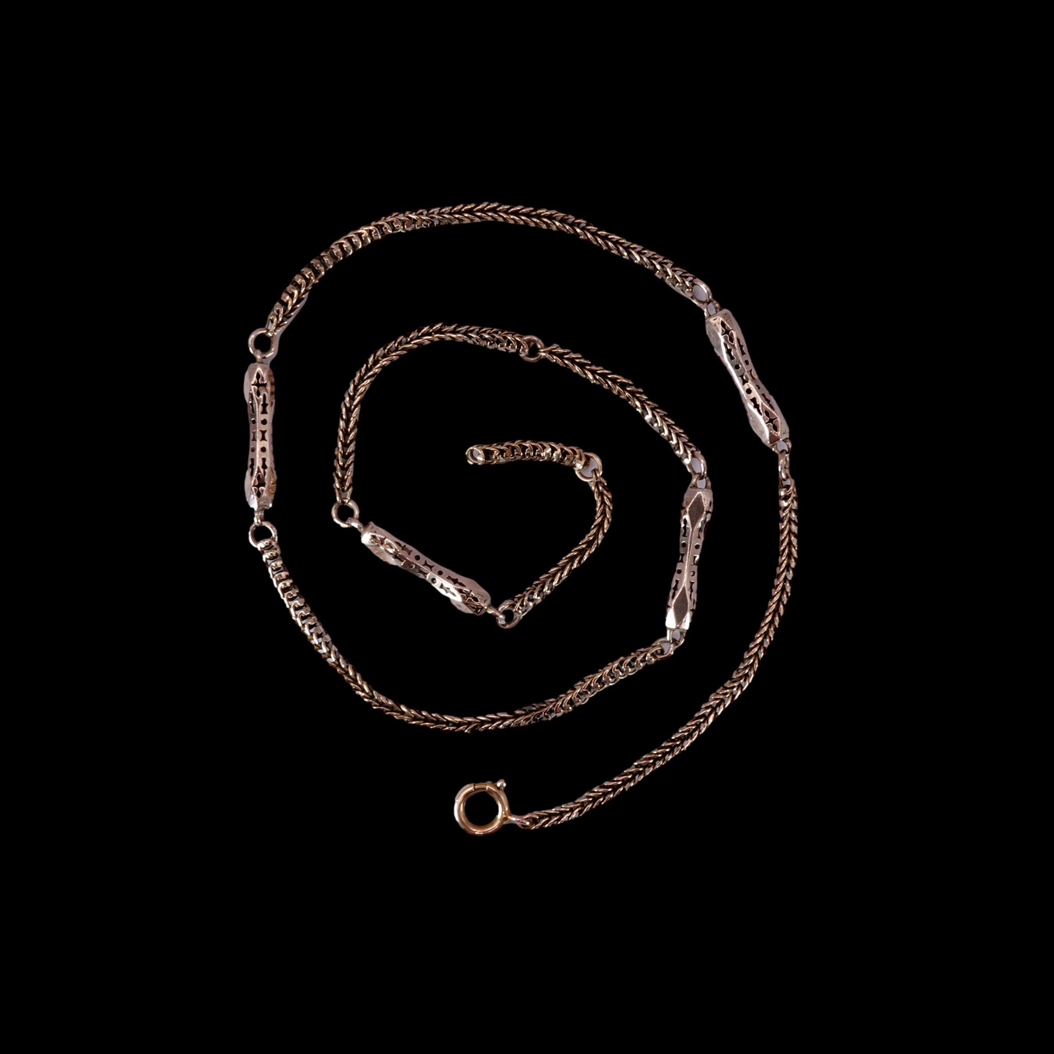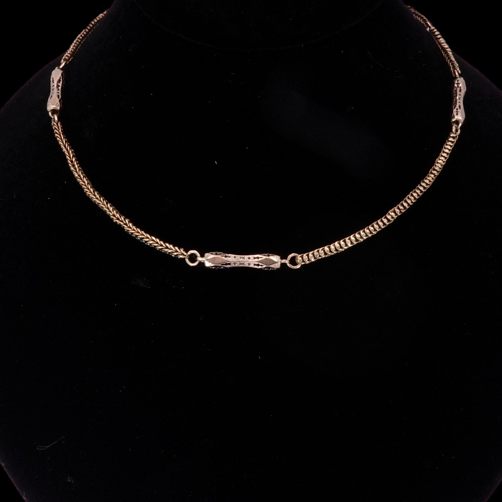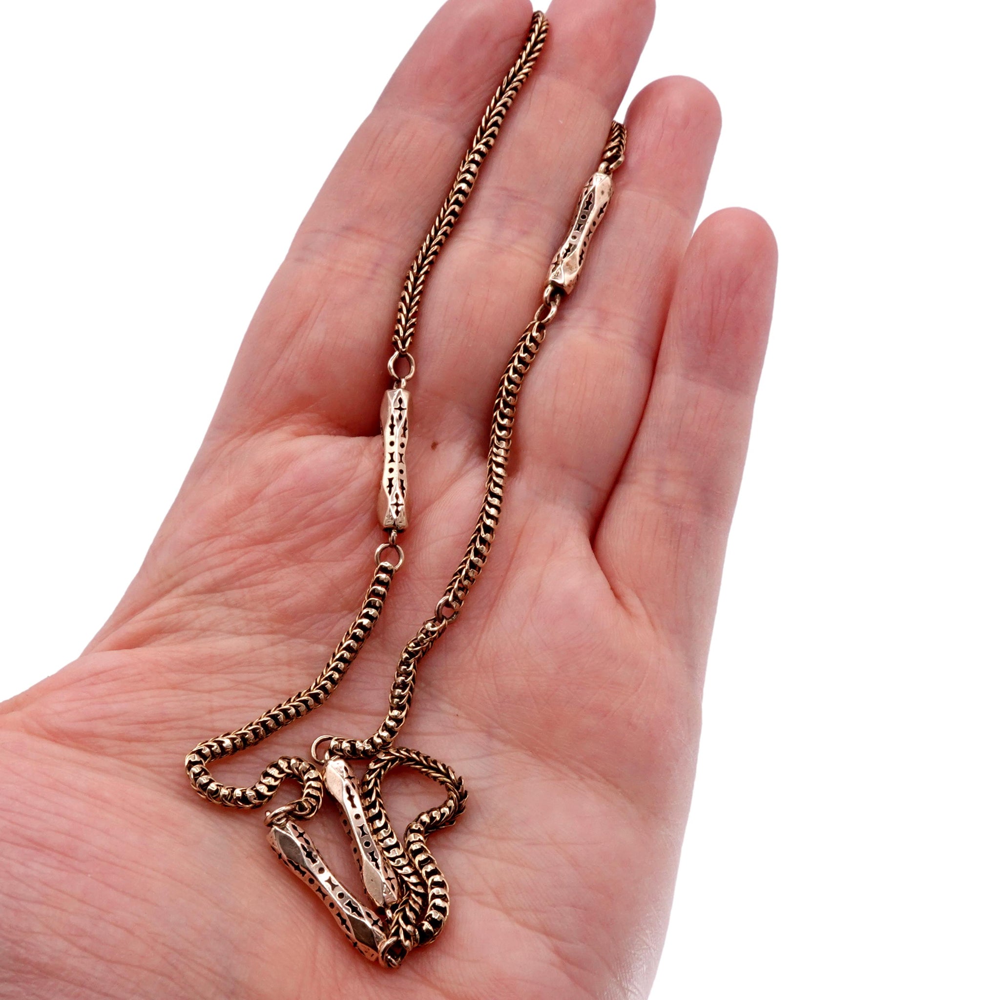 This beautiful authentic Victorian solid 9k yellow gold chain has been converted from a pocket watch chain. Measuring 16 inches long with 4 ornate oblong links connected by a flexible snake chain with a more modern secure jump ring closer.