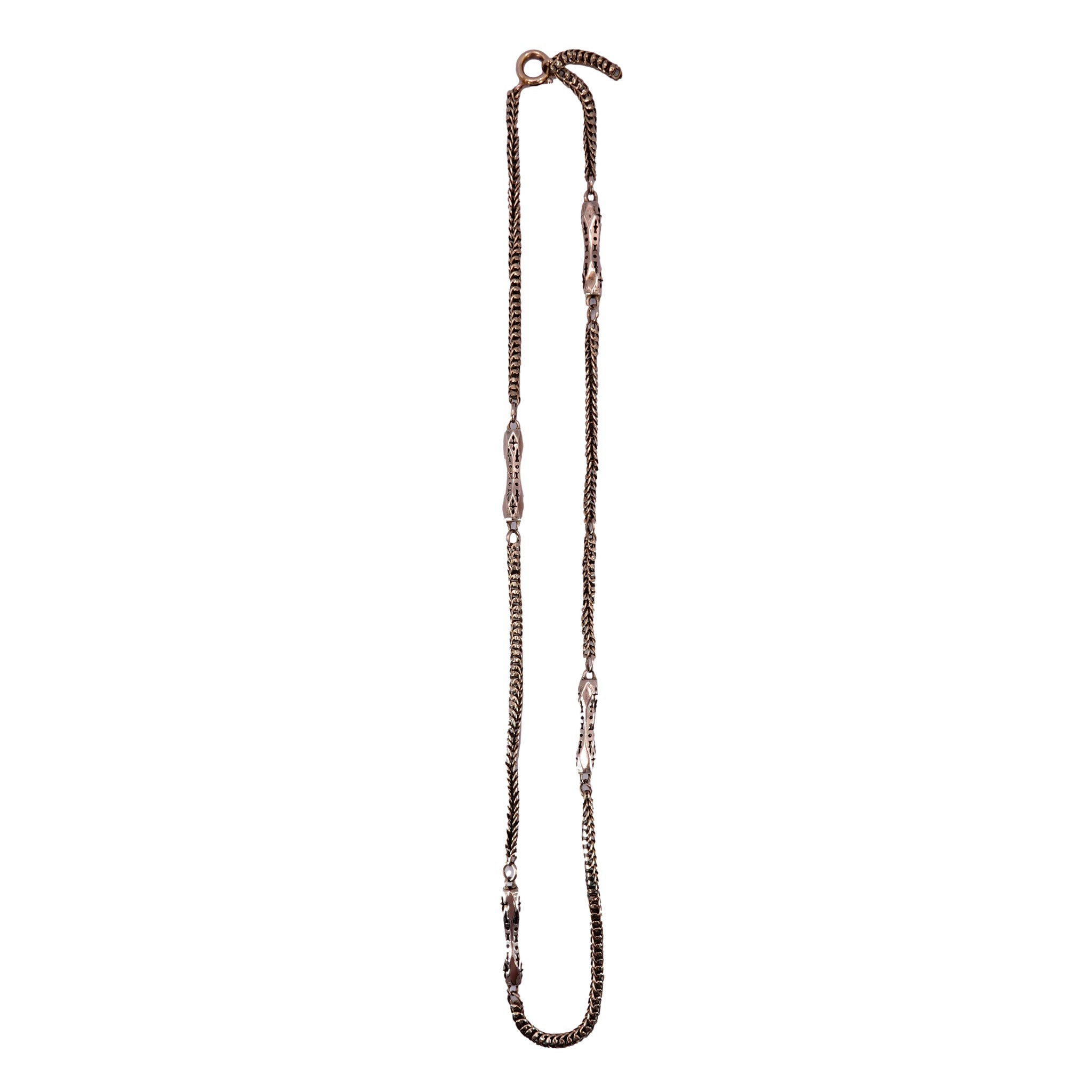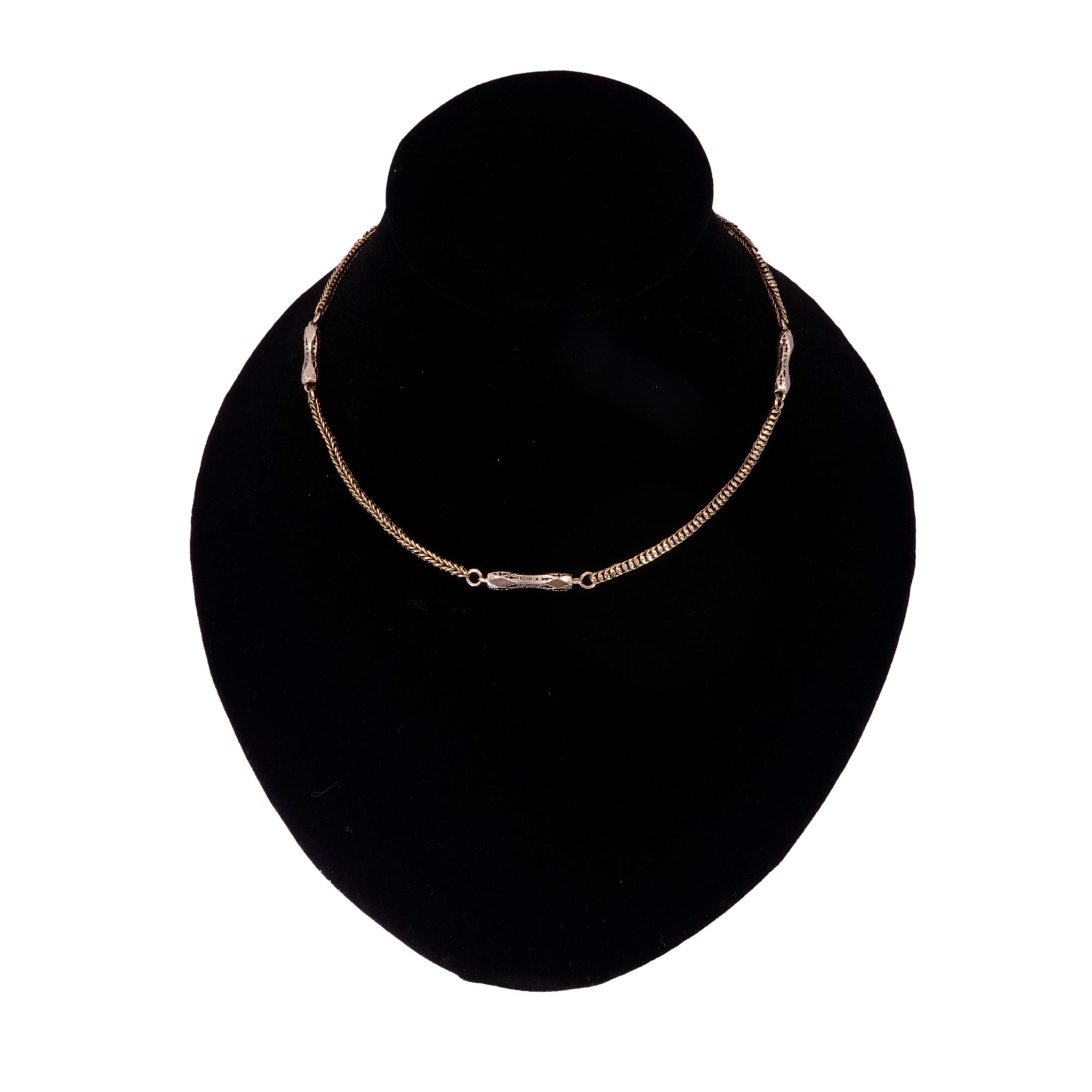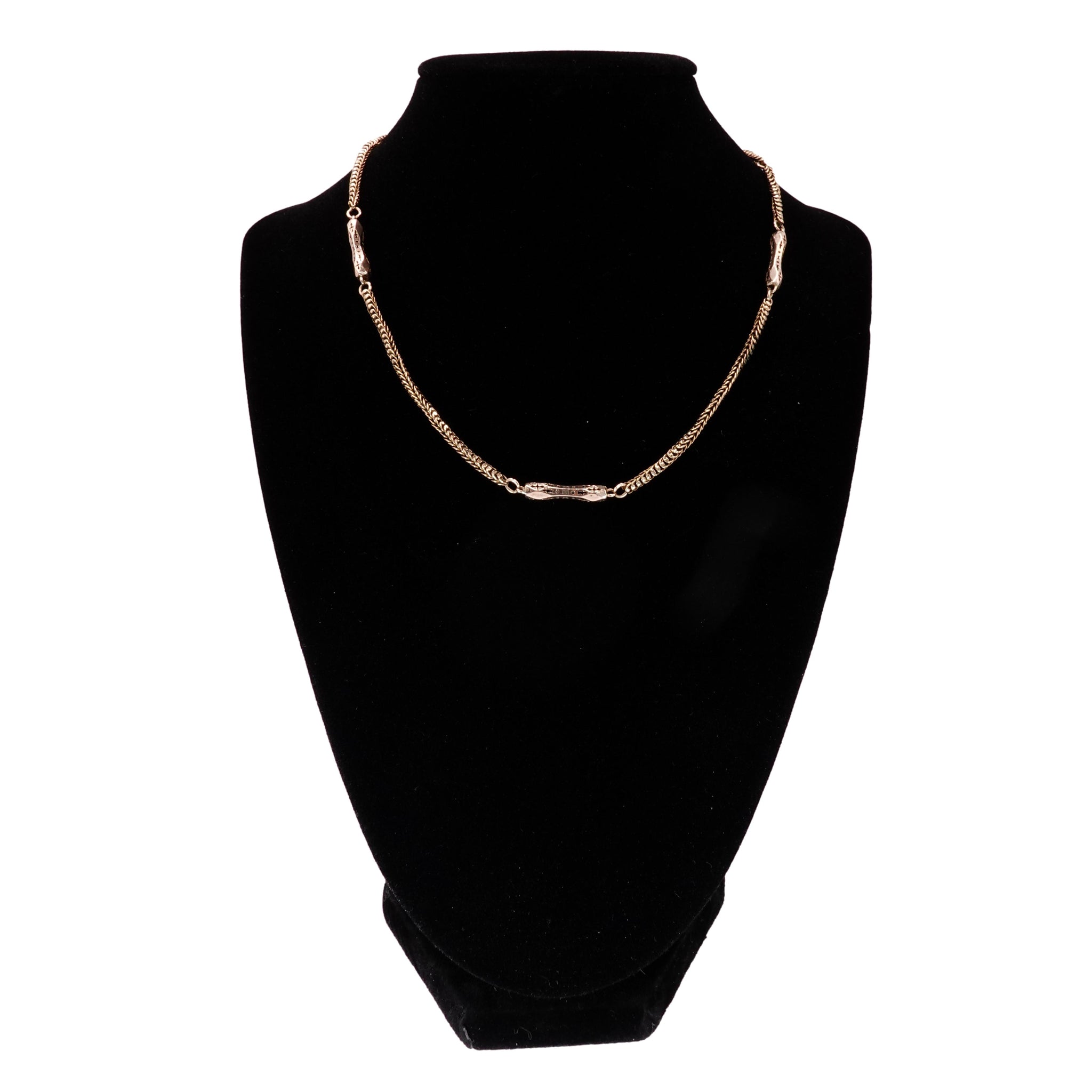 This beautiful authentic Victorian solid 9k yellow gold chain has been converted from a pocket watch chain. Measuring 16 inches long with 4 ornate oblong links connected by a flexible snake chain with a more modern secure jump ring closer.