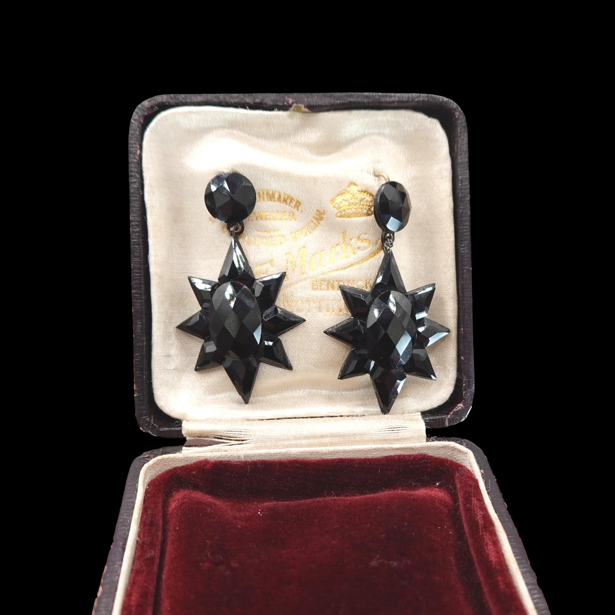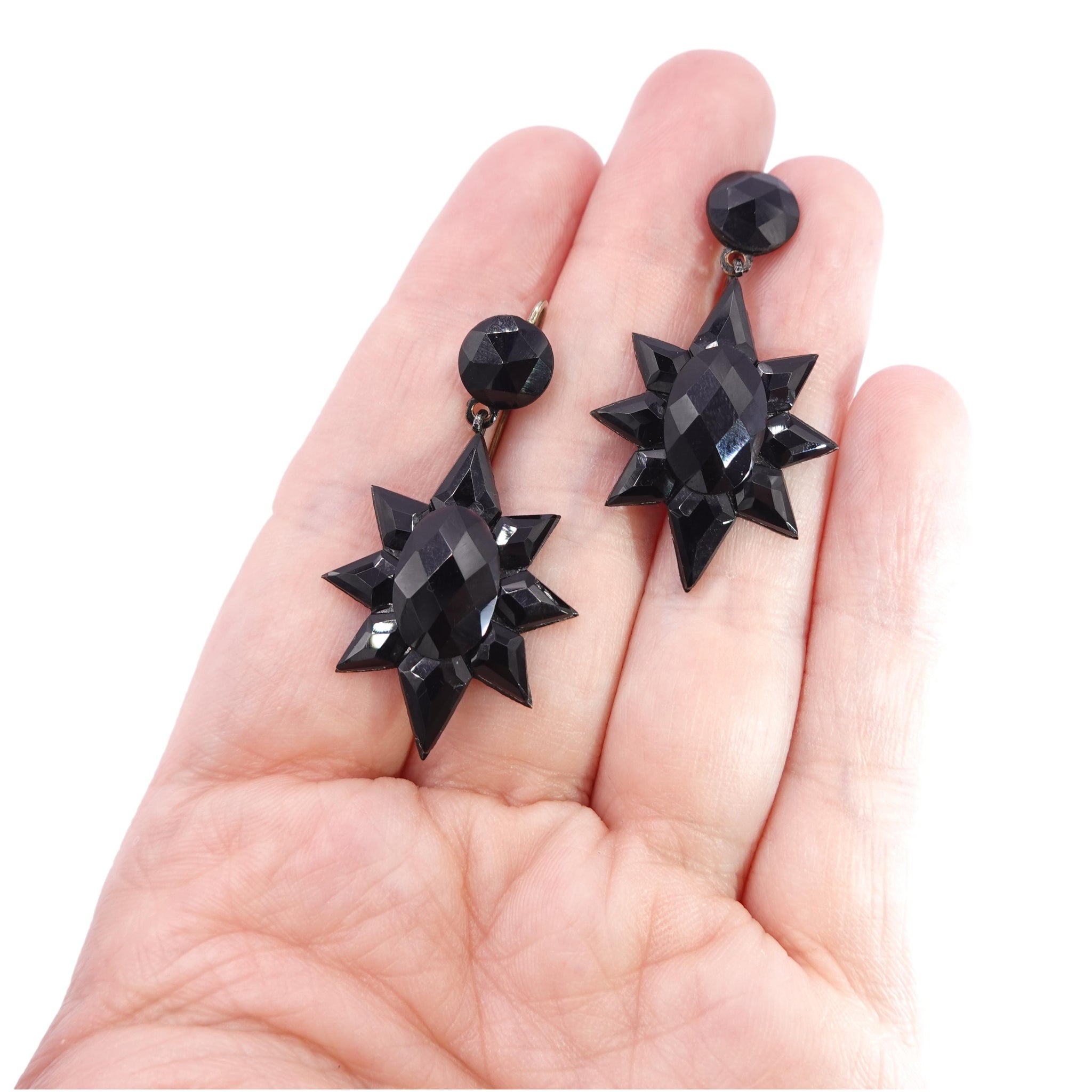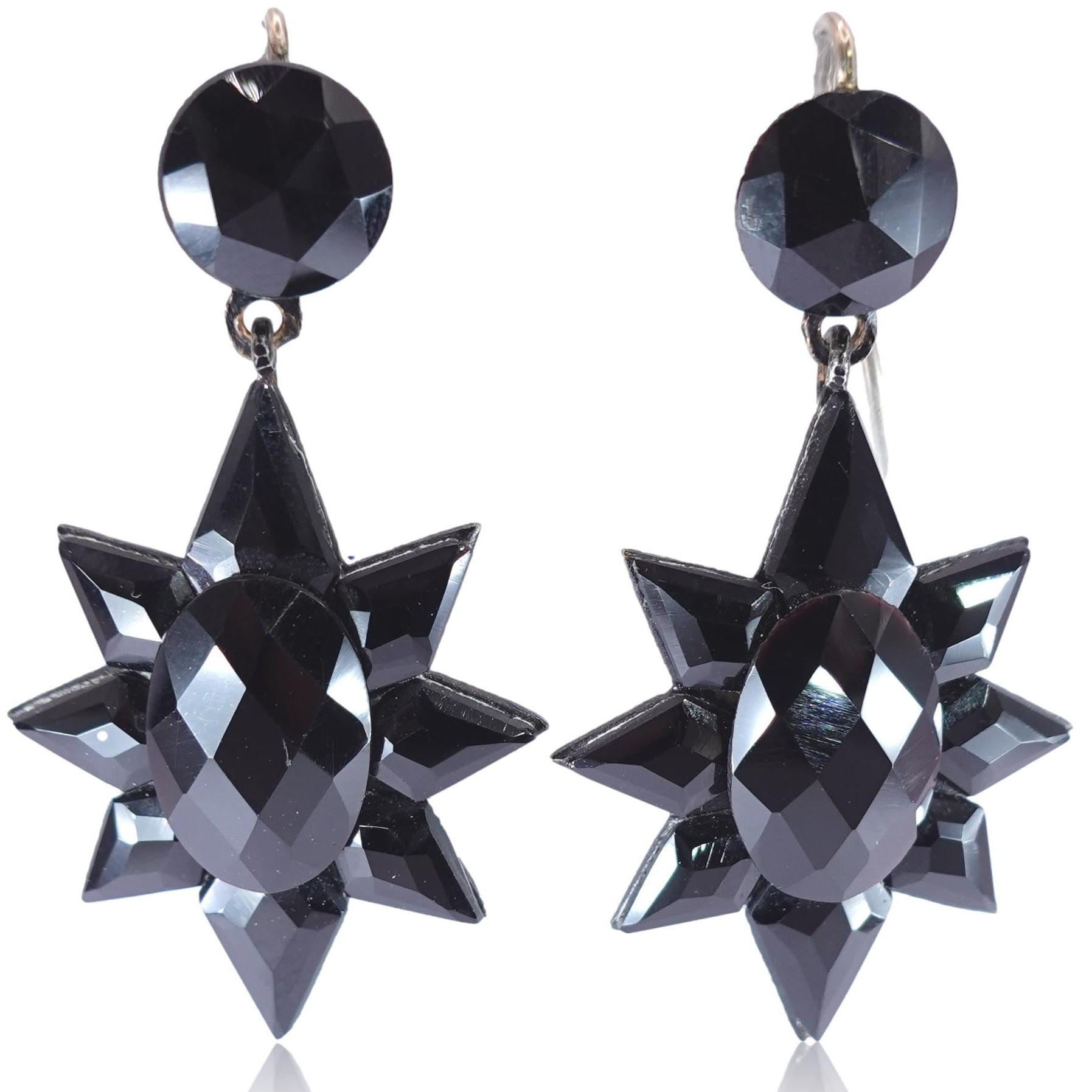 These exceptional authentic antique Victorian earrings date from the mid-19th century circa 1860. Crafted out of faceted black mirrored glass known as "French Jet" - it is the black version of the popular "Vauxhall glass" from the same period, they shine and catch the light beautifully. Originally used in mourning attire these attractive earrings are extremely striking and wearable today. A large starburst motif is suspended from a faceted circular top in the "top and drop" style of Victorian earrings. Set in a silver-colored metal.
