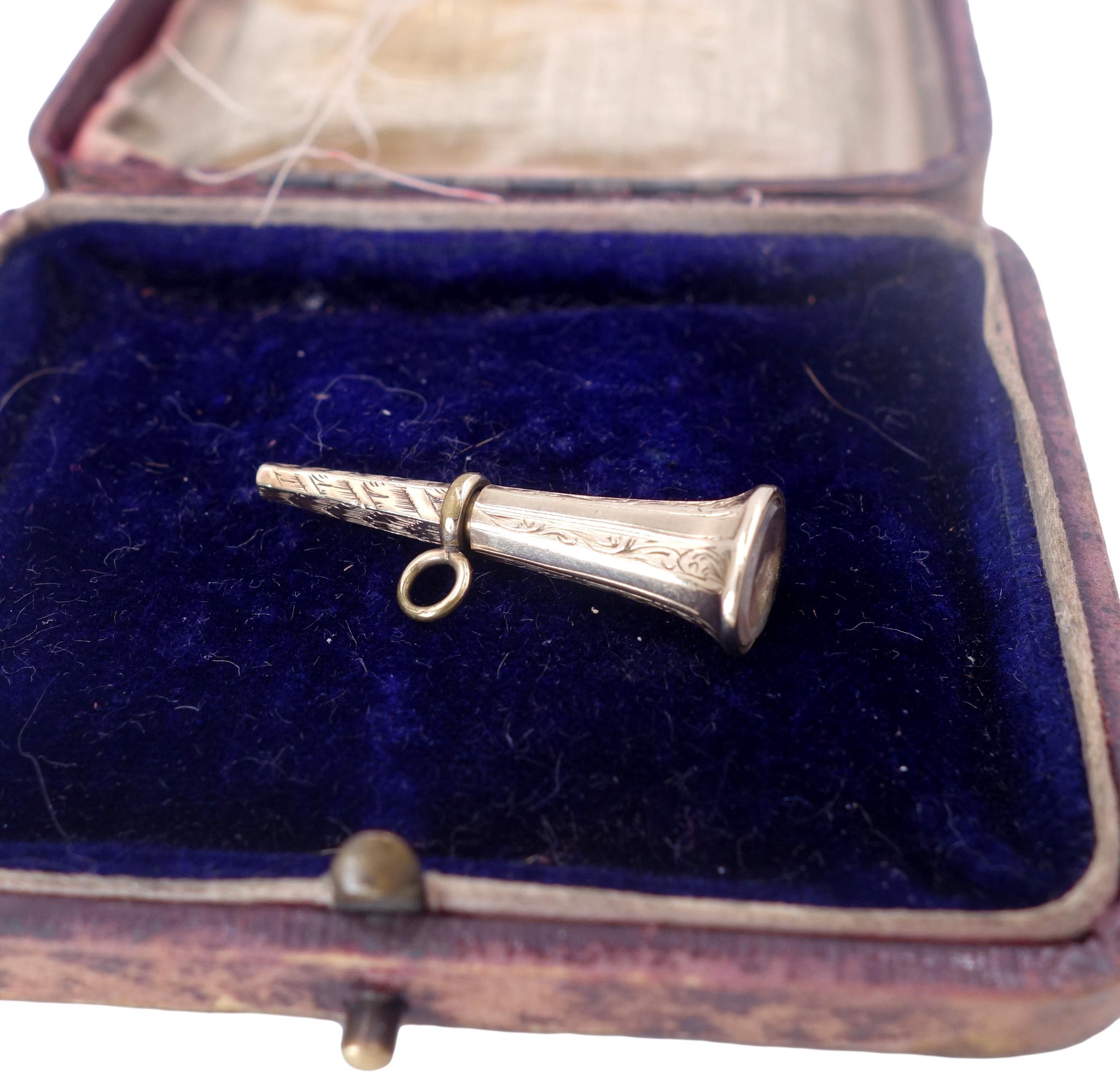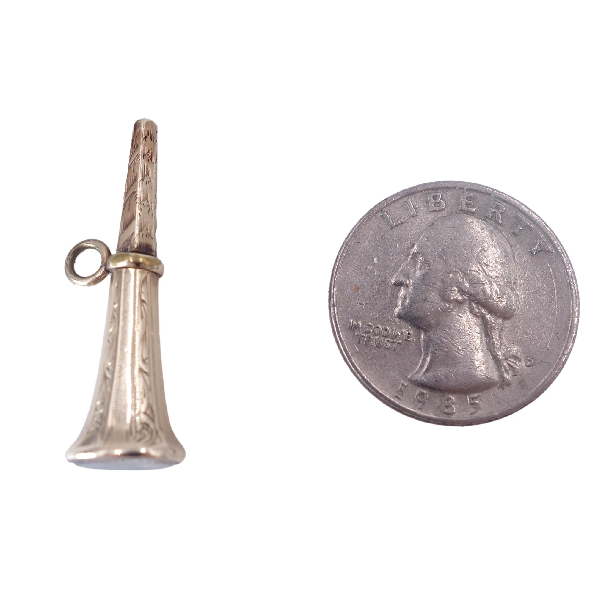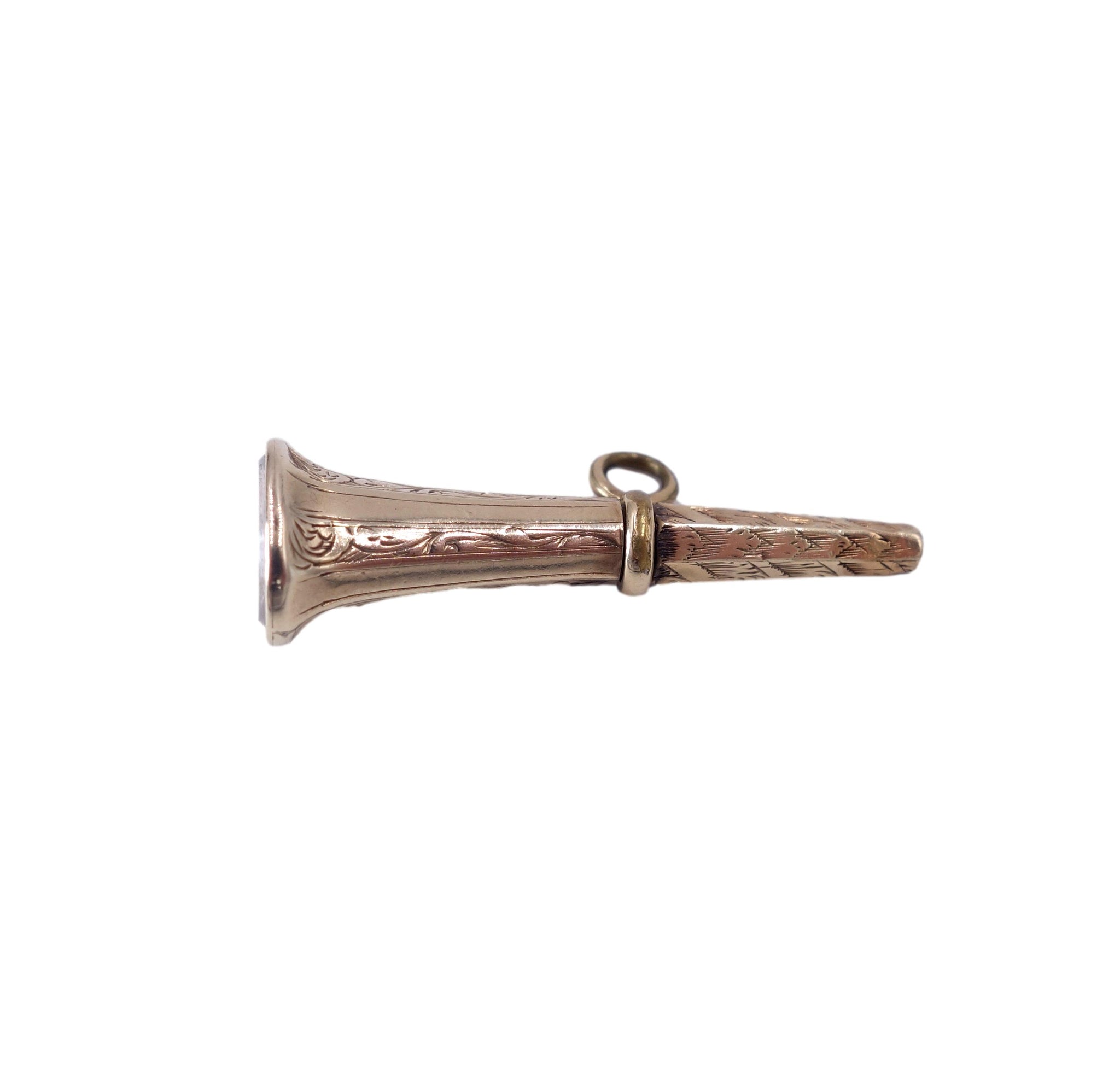 This lovely piece of Victorian history dating from the 19th century is a watch key - a decorative piece used to wind pocket watches. Made with a pendant loop so it could be worn on the chain it makes a lovely and affordable pendant today! Made in a trumpet shape with a foiled crystal to the end. Gold cased - meaning the outer decoration is made of 14k gold.