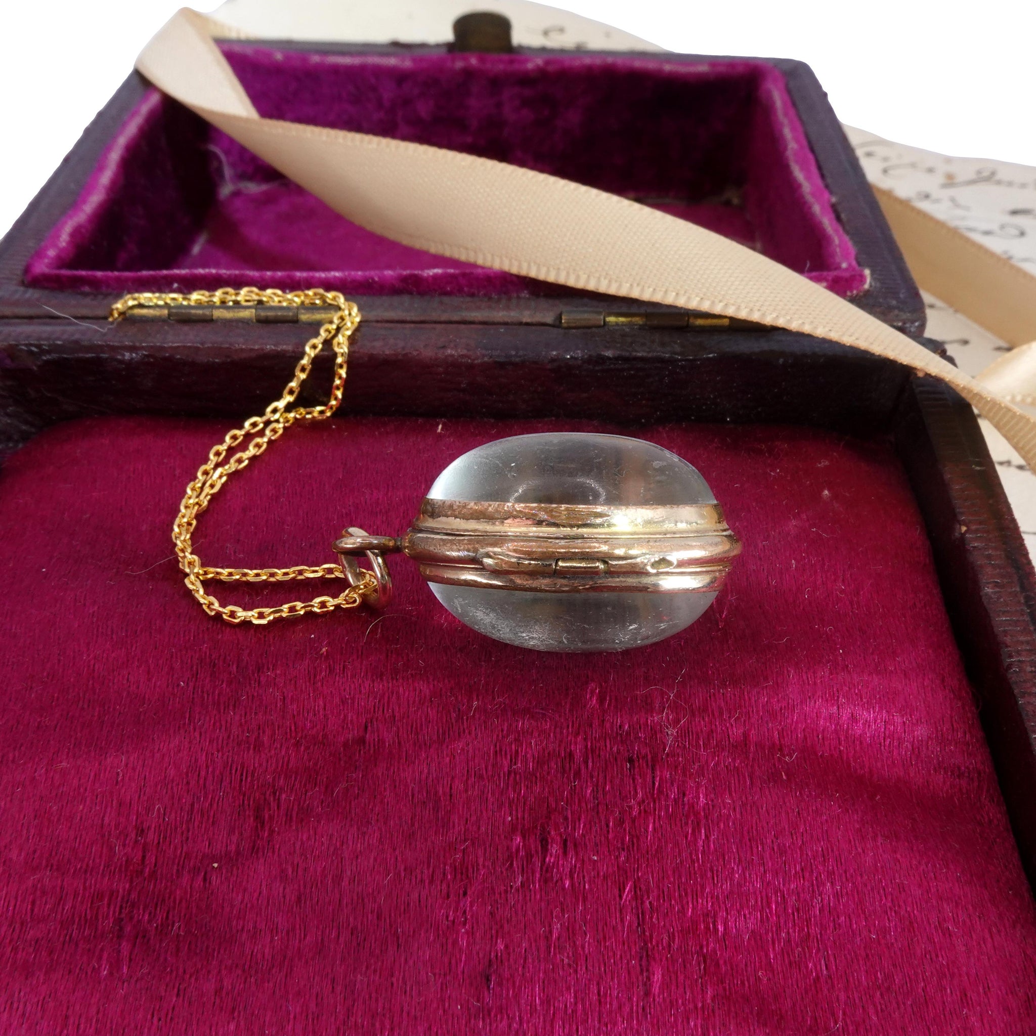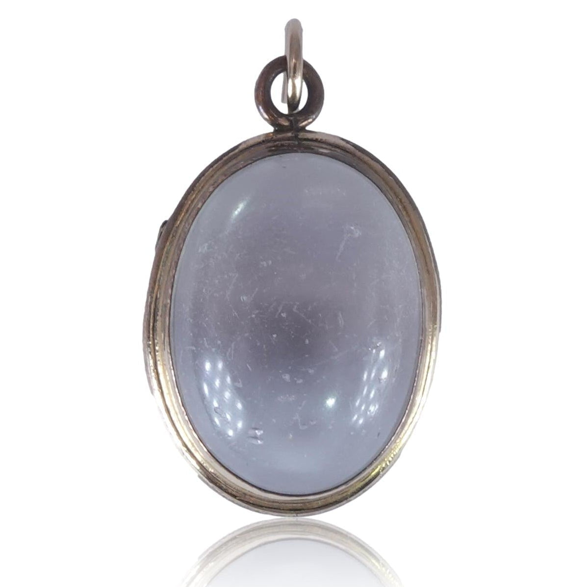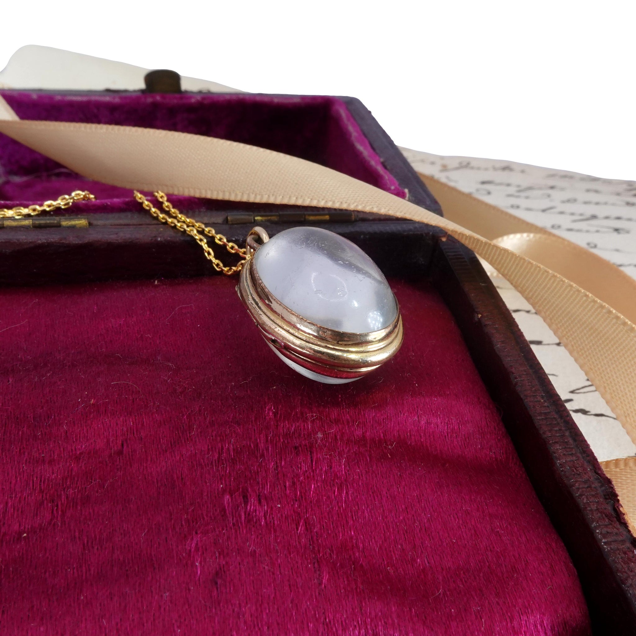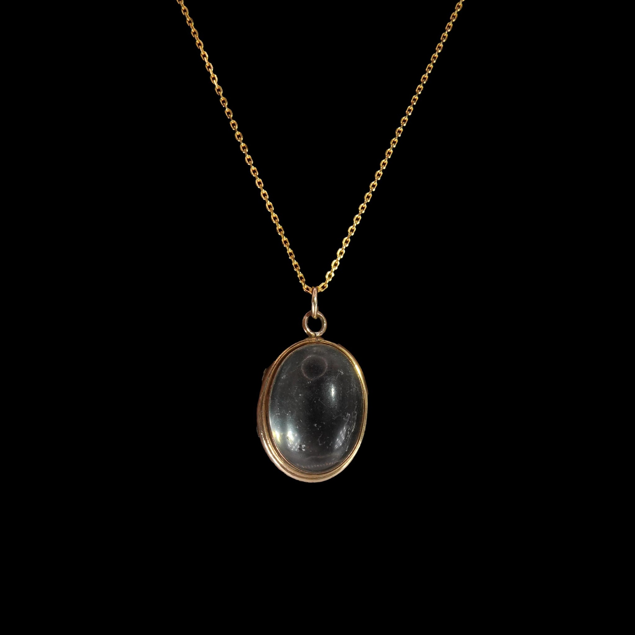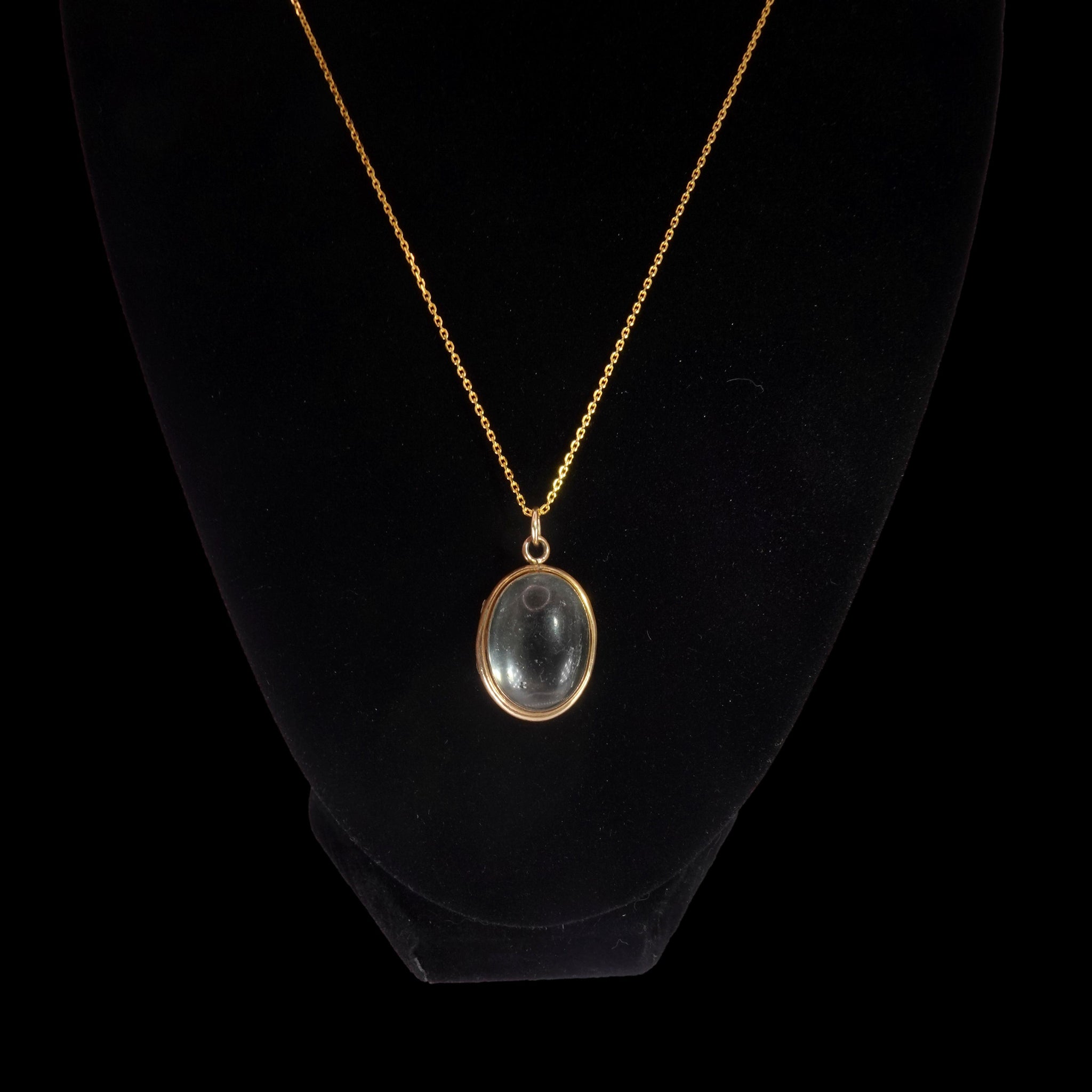 A very sought after and charming antique Victorian collectible circa 1900. This rounded oval crystal locket is known as a "pool of light." In a hinged locket setting - it fully opens to put a photo or memento and it naturally magnifies. It also beautifully catches the light - giving it its name. Set in a gold-colored metal with a loop bale.