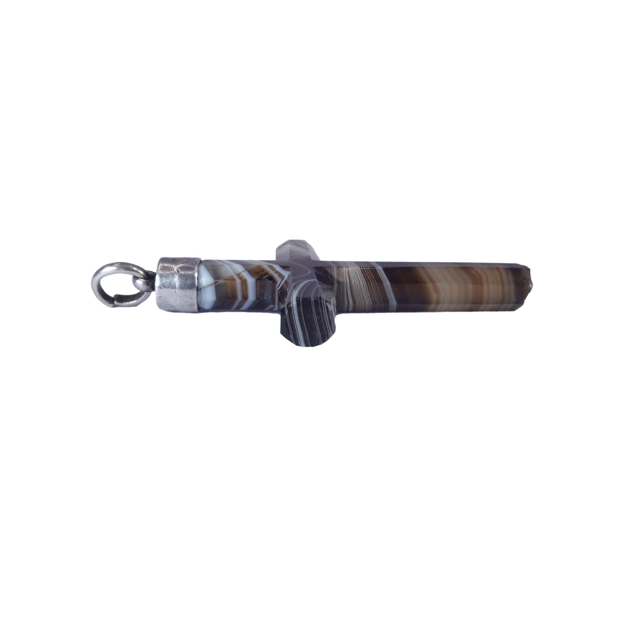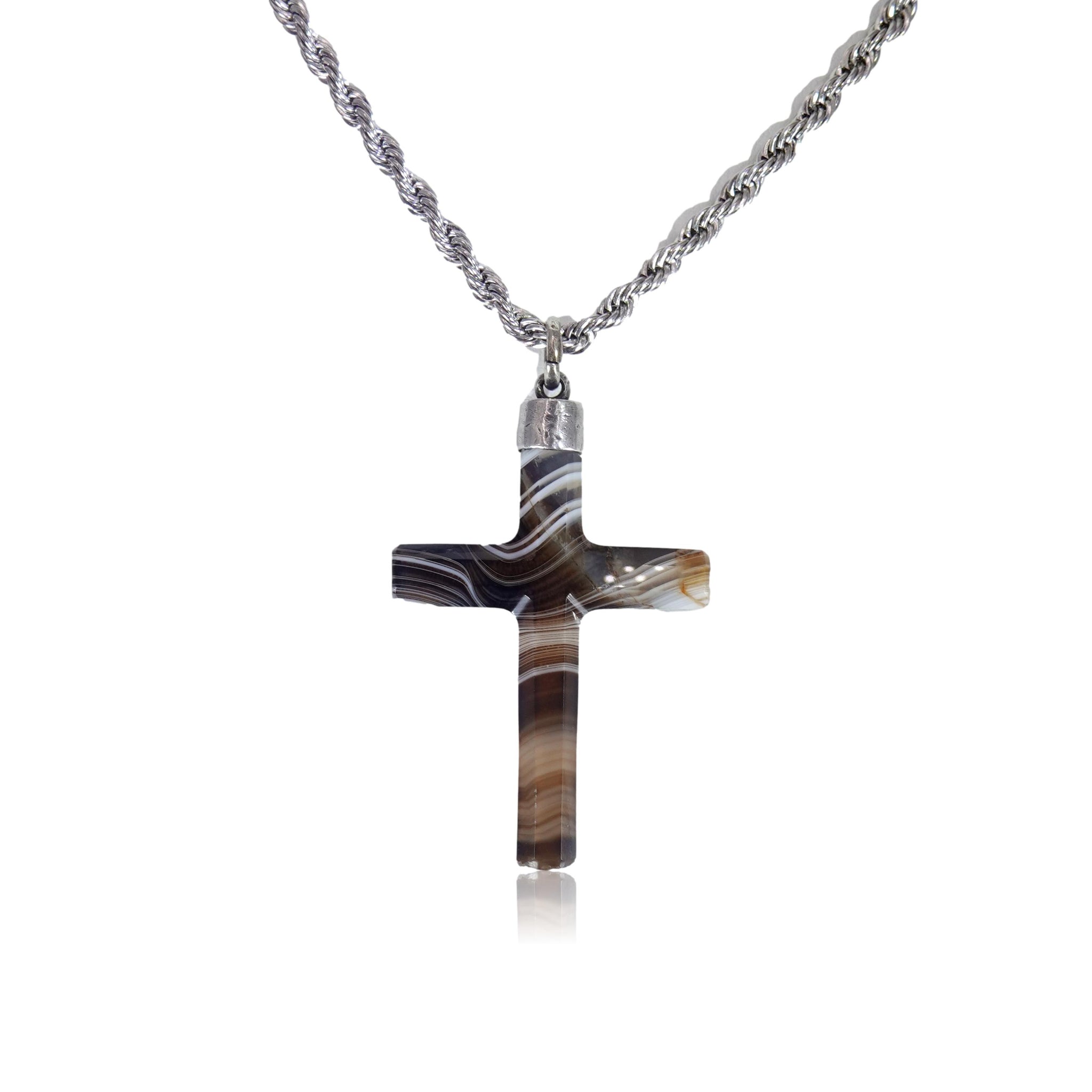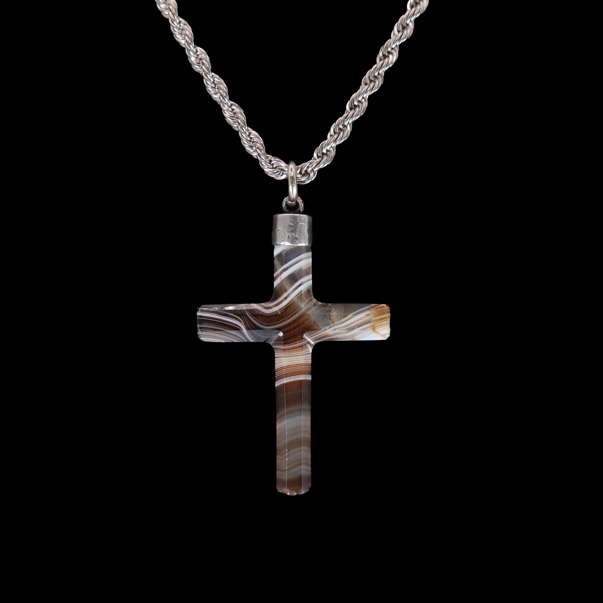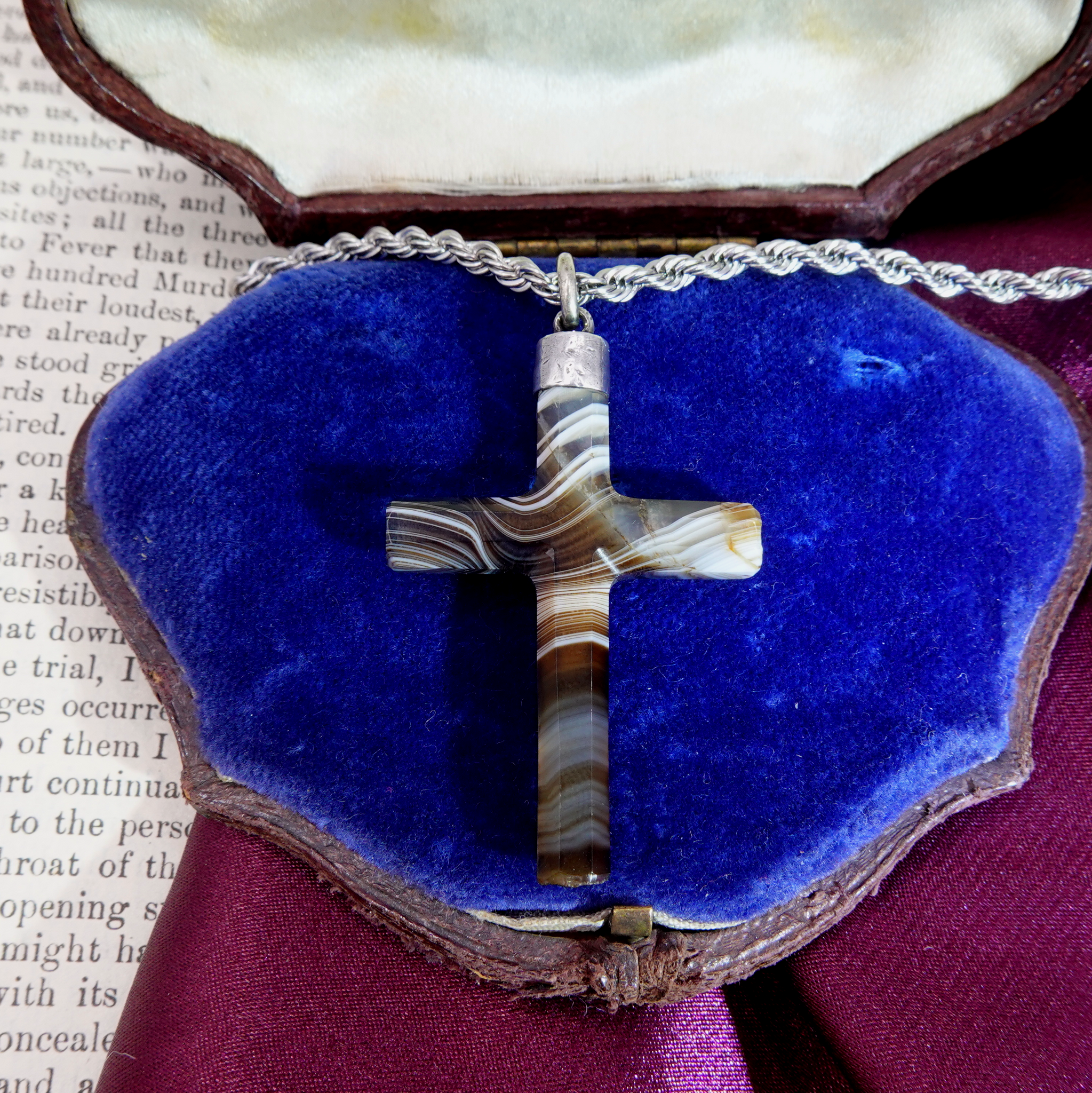 An absolutely incredible meeting of design and material in this late 19th Century antique Victorian cross pendant. Made entirely of a single piece of striped agate and topped with a silver cap and bale it shows the fascination Victorian's had with this stone. Agate features prominently in Scottish jewelry from this period- circa 1880 - as do crosses and this is a wonderful combination. Brown, grey and white swirl beautifully in an organic pattern that comes alive in the light.